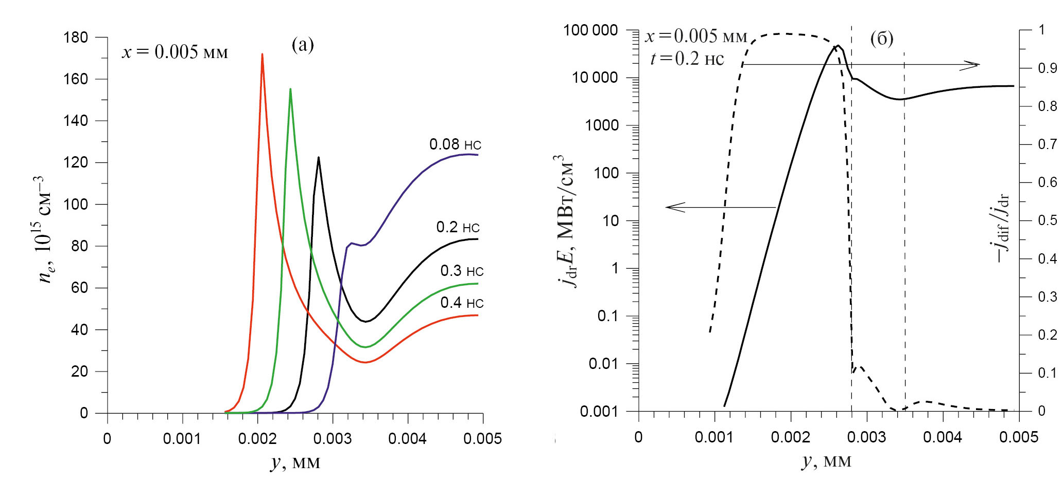 Рис. 5. Эволюция профиля ne в сечении разряда х = 0.005 мм; азот N2, V = +40 кВ, N/N0 = 8 (а); профили дрейфовой компоненты мощности энерговклада jdr E и отношения потоков –jdif /jdr в сечении разряда х = 0.005 мм в момент t = 0.2 нс (б)