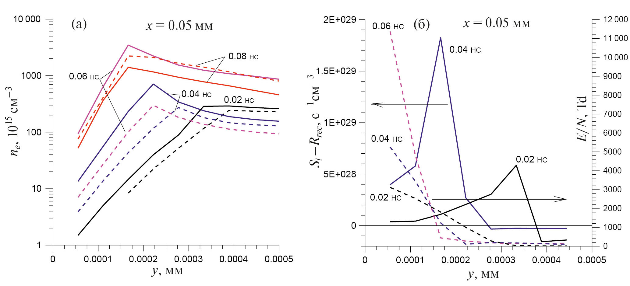 Рис. 7. Эволюция профиля ne в сечении разряда х = 0.05 мм в N2 (сплошные кривые) и воздухе (штриховые); V = –40 кВ, N/N0 = 6 (a); эволюция профилей источника избыточной ионизации (сплошные кривые) и E/N (штриховые) в сечении разряда х = 0.05 мм в азоте N2; V = –40 кВ, N/N0 = 6 (б)