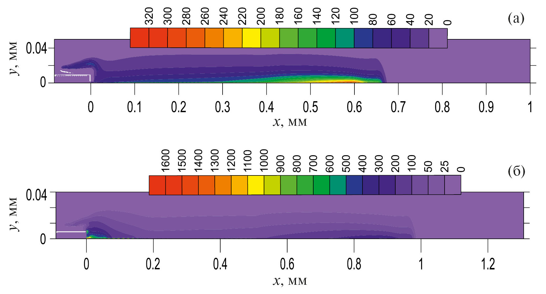Рис. 8. Пространственные распределения ne в воздухе в ед. 1015 см–3 в моменты 0.06 (a) и 0.08 нс (б); V = –40 кВ, N/N0 = 6