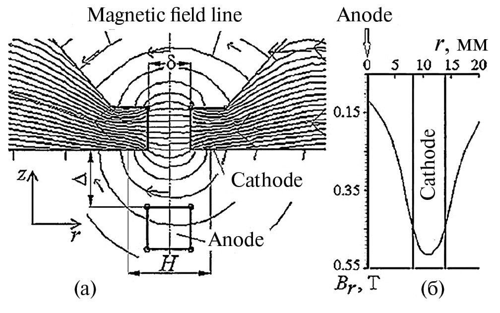 Рис. 1. (а) — Схема разрядного промежутка УАС; (б) — пример распределения радиальной компоненты индукции магнитного поля вдоль разрядного промежутка; d = 6 мм; D = 10 мм; Н ≈ 14 мм — область эмиссии электронов с поверхности катода