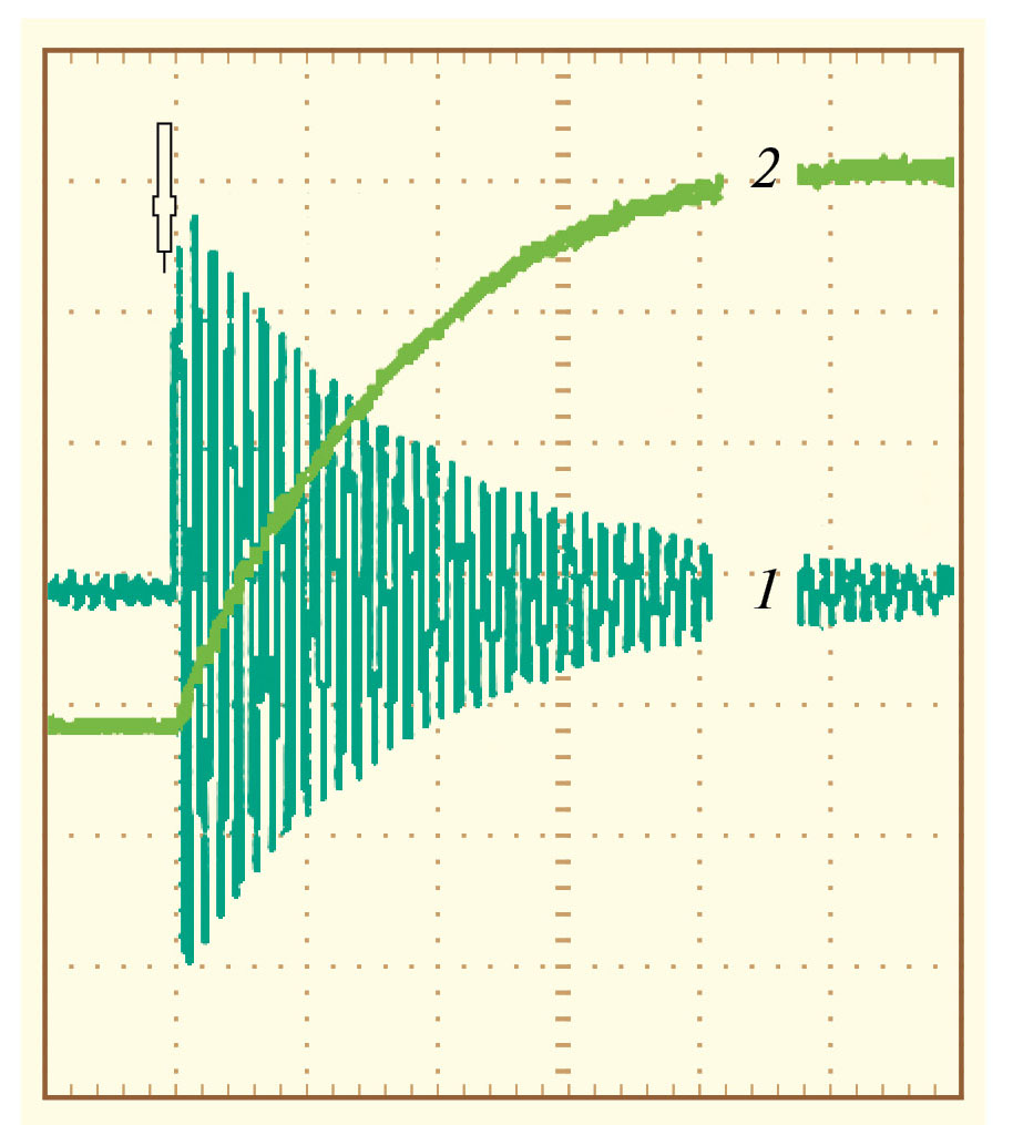 Рис. 2. Неон, скорость напуска q = 120 sccm, Uig = 840 В, Big = 0.24 Тл; кривая 1 — сигнал с пояса Роговского; 2 — сигнал с ионного датчика; масштаб по оси времени M = 250 мкс/дел