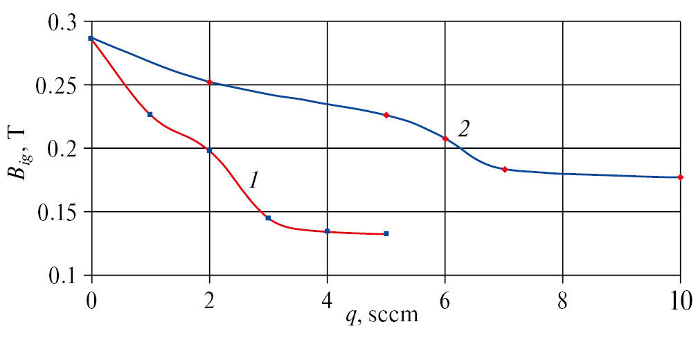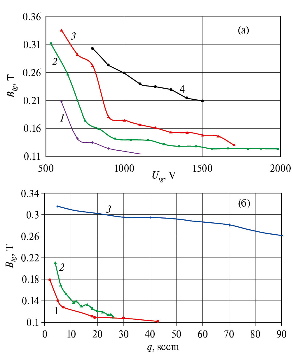На рис. 5a приведены кривые Вig = f (Uig) для двух- и трехкомпонентных смесей аргона, криптона и неона. При заданных скоростях напуска газов наименьшие критические магнитные поля и наиболее широкий рабочий диапазон обнаружены для трехкомпонентной смеси плазмообразующих газов. Увеличение скоростей напуска сдвигает графики вниз, не изменяя характера зависимости Вig = f (Uig).