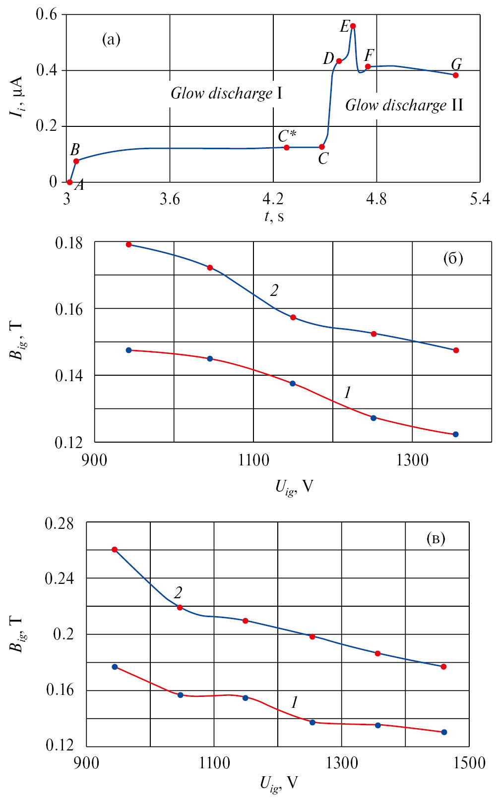Получение кривой зажигания начиналось с выбора и фиксации Uig и затем медленно, для наглядной визуализации изменения тока ионов во времени, увеличивалось магнитное поле в УАС до момента появления бросков ионного тока на коллекторе ЭЗП – первого, а затем и второго пробоя разрядного промежутка.