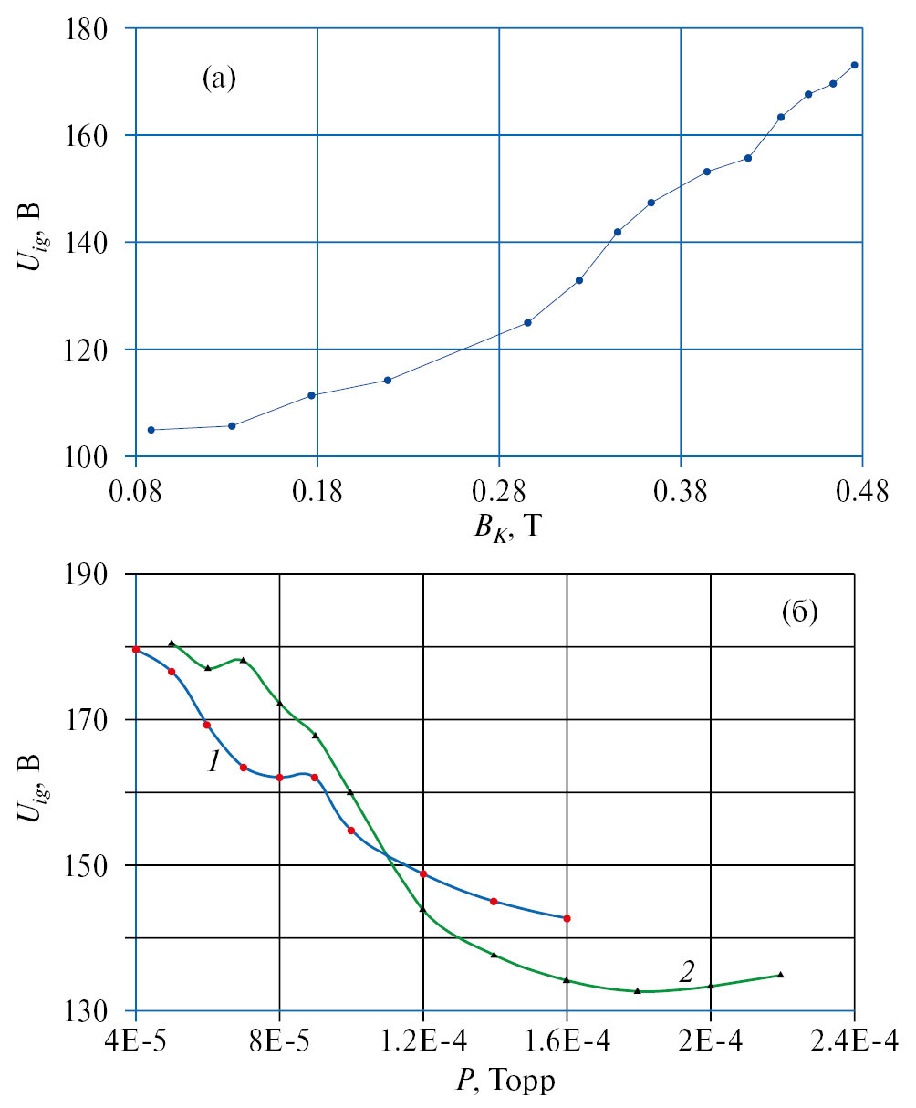 Для перечисленных во введении устройств с E×B-разрядом характерно их использование при давлениях рабочего плазмообразующего газа Р ≤ 10–4 Торр, поэтому можно уточнить, имея в виду классические кривые Пашена, что для E×B-разряда зависимость Вig = f(Uig) и другие — это левые ветви кривых зажигания. В качестве Big в экспериментах принимались значения радиальной компоненты магнитной индукции в месте рождения электронов — на катоде. Они рассчитывались по измеренному в момент пробоя току в цепи катушки, создающей магнитное поле в УАС.
