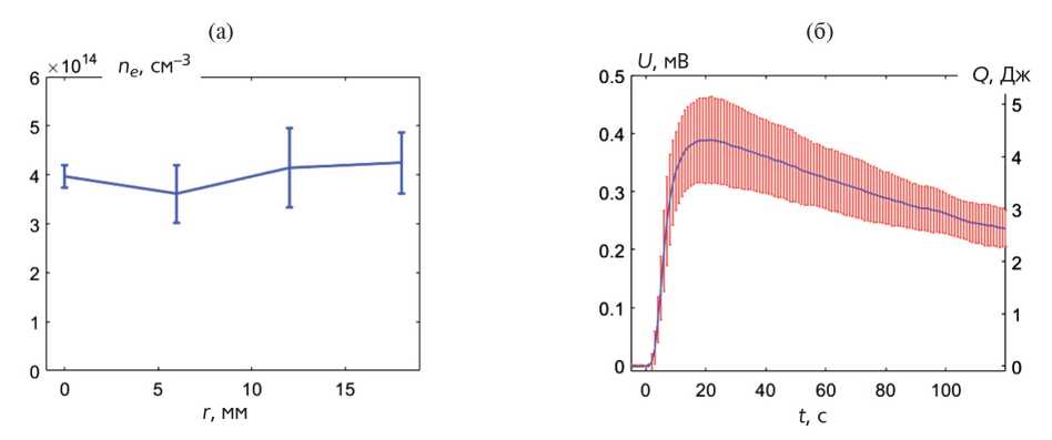 Рис. 2. Распределение плотности по радиусу плазменного столба в момент 2 мкс (а) и энергия в импульсе излучения, которая зарегистрирована калориметром за выходным окном из полиметилпентена (б). Результаты усреднены по пяти выстрелам в одинаковых условиях по пучку и плазме.
