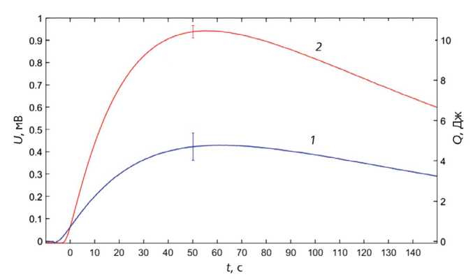 Рис. 4. Энергия в импульсе излучения, измеренная калориметром в случае его присоединения непосредственно к вакуумной трубе, в режиме с плотностью тока пучка 1 кА/см2 (кривая 1) и с плотностью тока пучка 2 кА/см2 (кривая 2).