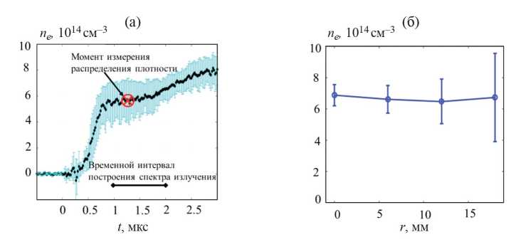 Рис. 5. Изменение во времени средней по диаметру плазменного столба плотности плазмы, зарегистрированное с использованием интерферометра Майкельсона на длине волны 10.5 мкм (а); распределение плотности плазмы по радиусу столба в момент 1.2 мкс, измеренное системой томсоновского рассеяния на длине волны лазера 1.053 мкм (б). Отчёт времени ведётся с момента начала инжекции РЭП.