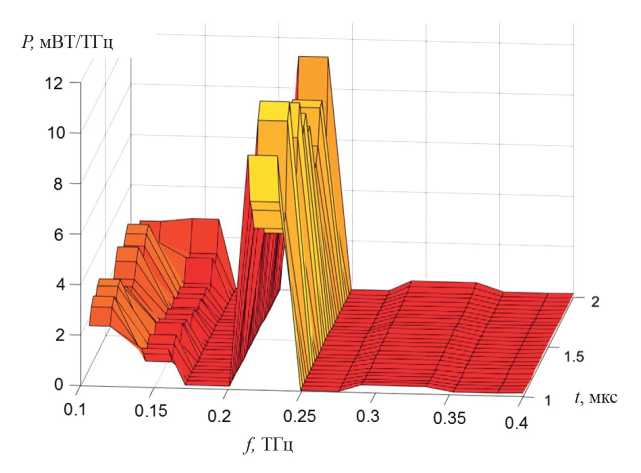 Как видно, в интервале частот от 0.1 до 0.4 ТГц высокая спектральная плотность излучения локализована в области 0.2—0.25 ТГц. В два раза ниже уровень спектральной плотности зарегистрирован в окрестности частоты 0.12 ТГц. В области частот выше 0.25 ТГц спектральная плотность пренебрежимо мала по сравнению с этими двумя обозначенными выше участками.