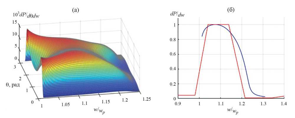 Рис. 7. Распределение спектральной плотности мощности в относительных единицах по оси частот в окрестности ленгмюровской частоты ωp: а) — расчётное угловое распределение спектральной плотности потока излучения в окрестности частоты ωp, положение которой на оси частот соответствует единице; б) — синей линией показана спектральная плотность мощности, полученная интегрированием по углам Θ распределения, представленного на рис. а), красной линией — контур частотной области с максимальной спектральной плотностью мощности излучения, построенный по результатам измерений восьмиканальным полихроматором.