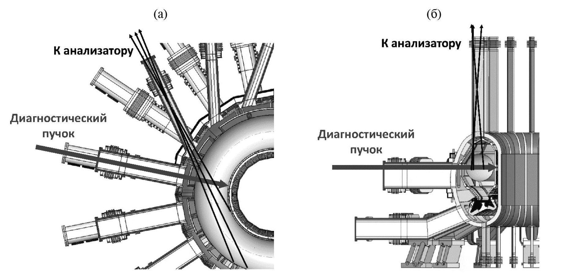 Отдельный интерес представляет возможность использования диагностического пучка для измерения потоков нейтрализованных knock-on ионов [6, 7]. Кnock-on ионы появляются в результате лобовых столкновений тепловых ионов основной плазмы с термоядерными альфа-частицами, и могут только за одно столкновение приобрести энергию порядка 1 Мэ В. Очевидно, что такие ионы рождаются в основном в центре плазмы, где максимальна плотность термоядерных альфа-частиц. Кроме того, если эти ионы в дальнейшем будут нейтрализованы, то высокая энергия позволит им покинуть плазму, не испытывая сильного ослабления. Таким образом, регистрация потоков нейтрализованных knock-on ионов дейтерия и трития позволяет получить информацию об изотопном составе в центре плазмы. В настоящее время на этом принципе основывается измерение изотопного соотношения плазмы в центре токамака-реактора ИТЭР [8, 9].