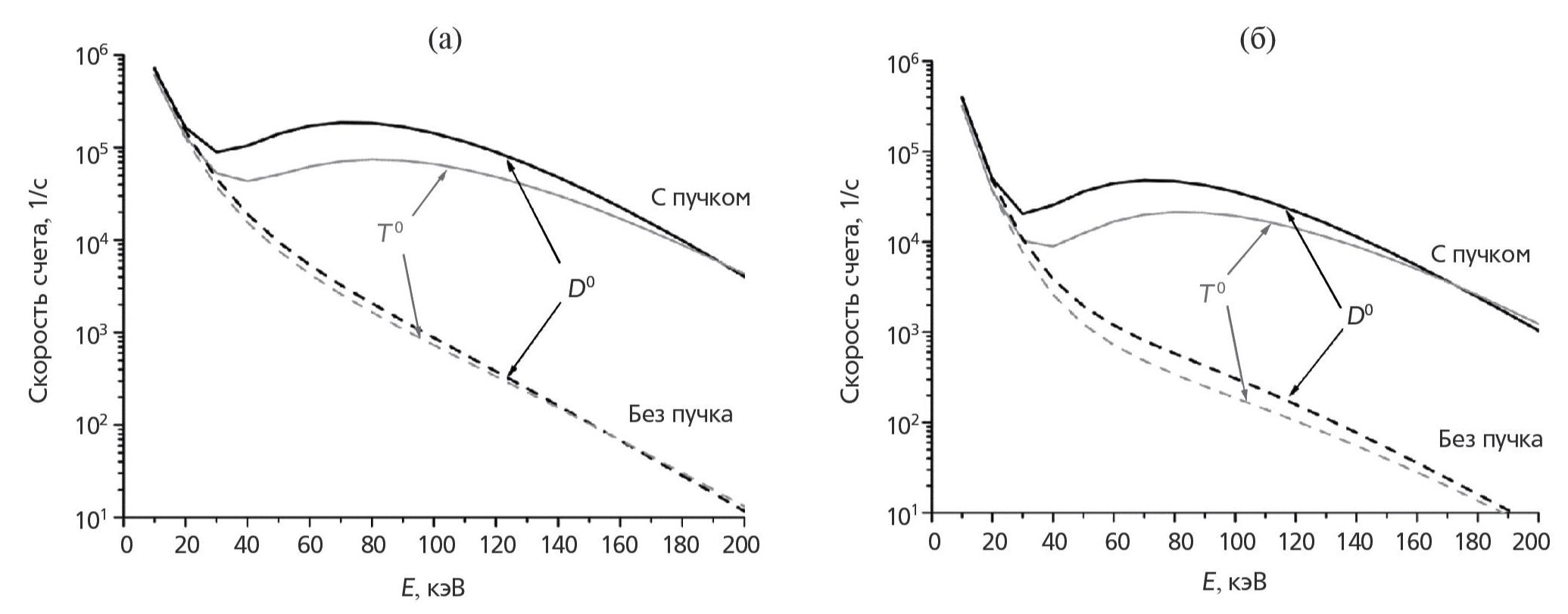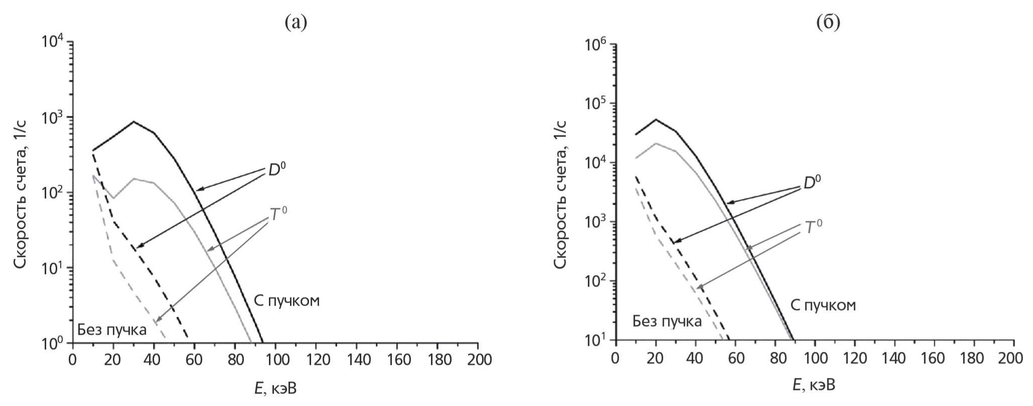 Для оценки временного разрешения АКД был проведен расчет скоростей счета атомов дейтерия и трития. Расчет проводился для анализатора атомов, имеющего следующие характеристики: эффективность регистрации — 30%, энергетическая ширина детекторного канала — 5%, телесный угол сбора — 3‧10–10 см2· стер. Для обеих схем наблюдения, на рис. 4 приведены результаты, полученные для «теплового» (до ~ 10Timax) энергетического диапазона, который обычно используется при измерении ионной температуры методом корпускулярной диагностики.