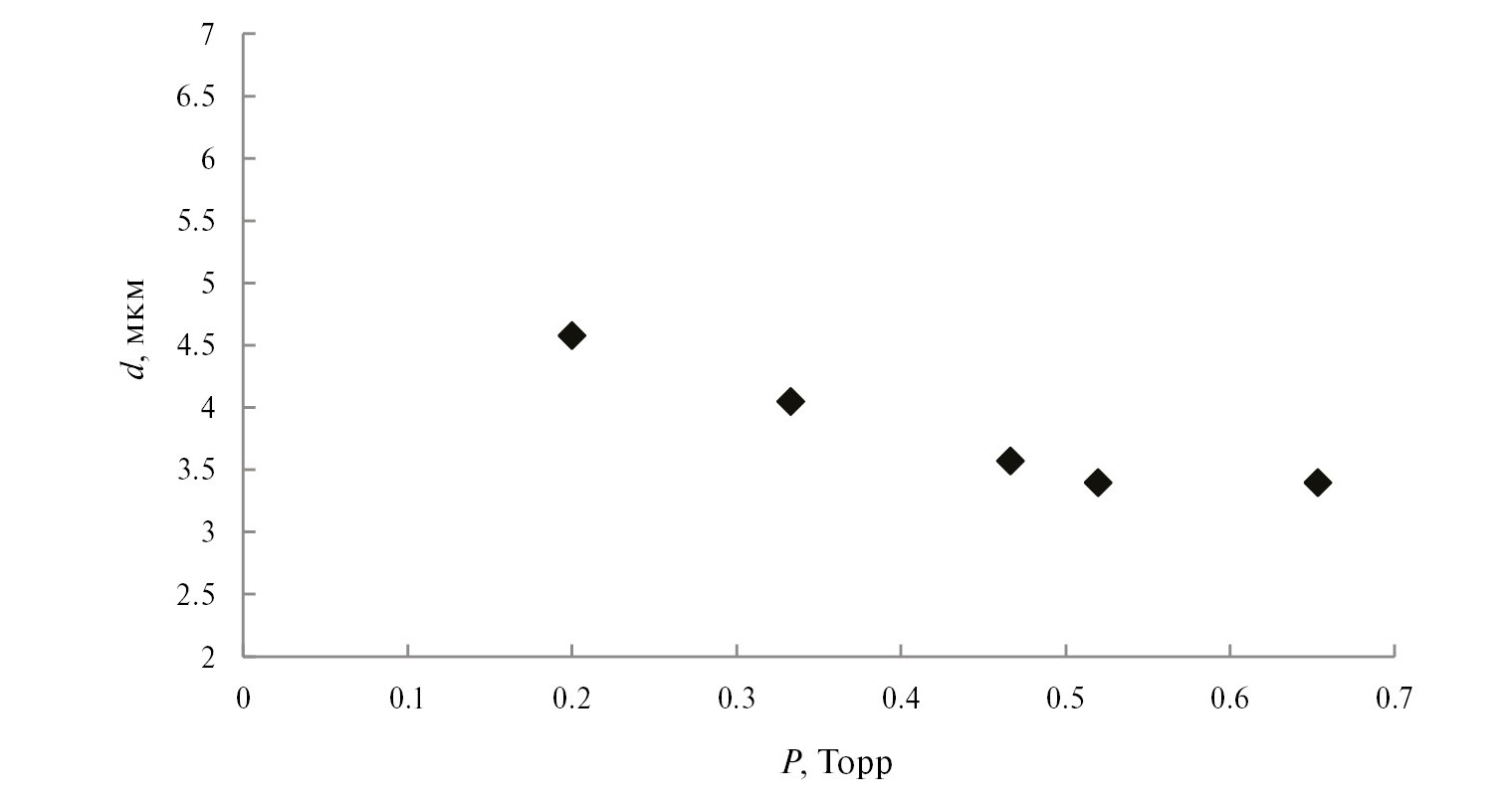 Рис. 4. Зависимость среднего размера пылевых частиц от давления неона. Условия: напряжение – 100 В, частота ВЧ-генерации – 40 МГц.