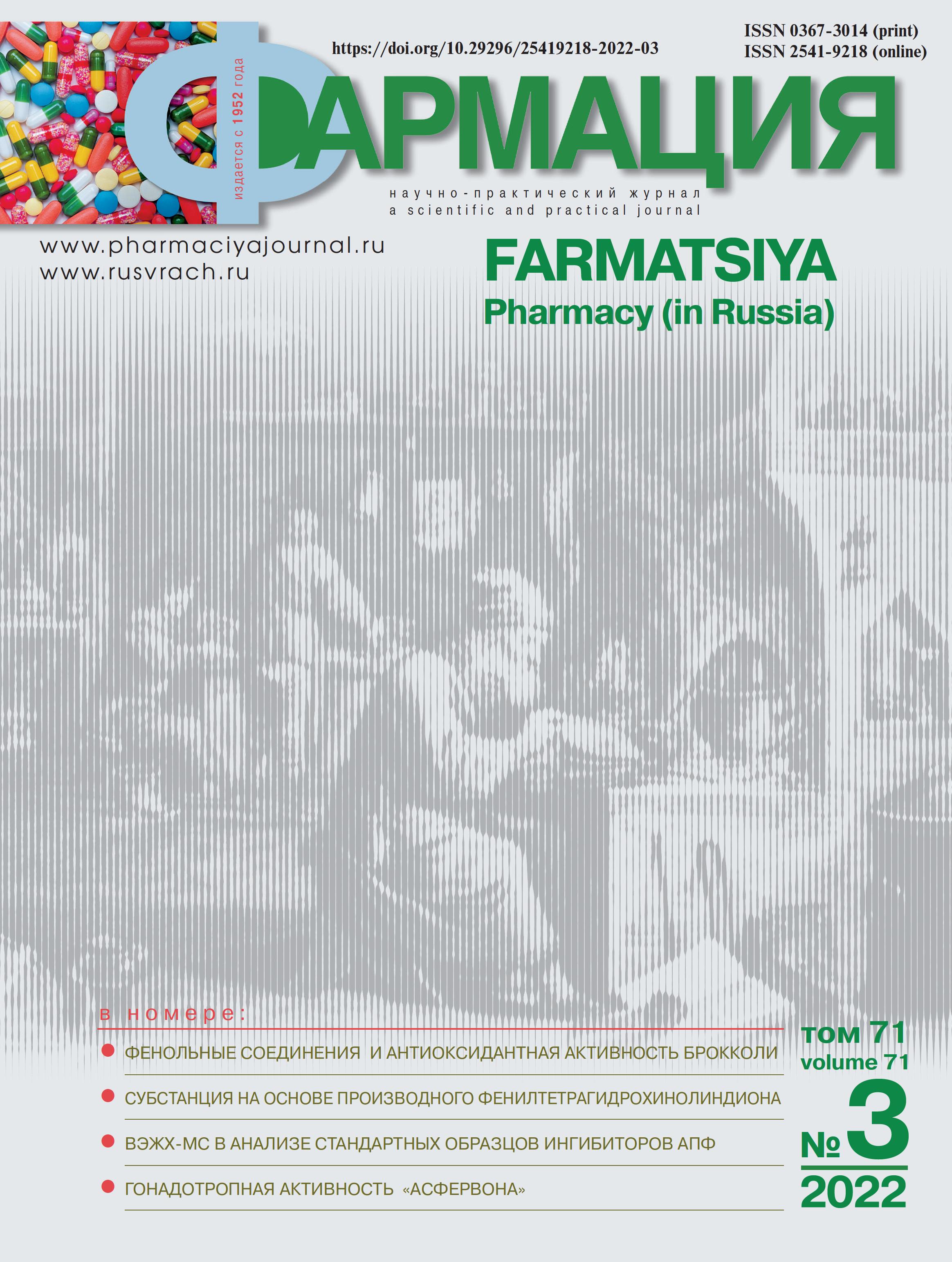Введение. Овощи семейства капустных являются функциональными продуктами питания, способствующими укреплению здоровья благодаря уникальному химическому составу. В частности, брокколи (Brassica oleracea L. var. Italica) особенно ценится за высокое содержание биологически активных компонентов, таких как вторичные метаболиты - глюкозинолаты и фенольные соединения. Многочисленные исследования in vitro и in vivo показали, что брокколи обладает различными биологическими свойствами, включая антиоксидантную, противораковую, противомикробную, противовоспалительную и противодиабетическую активность. Цель исследования. Изучение качественного состава и количественного содержания фенольных соединений и определение антиокисдантной активности в соцветиях капусты брокколи. Материал и методы. Для исследования фенольного профиля использовали методы тонкослойной хроматографии, спектро-фотометрии, ультраэффективной жидкостной хроматографии в сочетании с фотодиодной матрицей и тройным квадрупольным масс-спектрометрическим детектором. Антиоксидантную активность определяли методом кулонометрии с помощью электро-генерированного брома. Результаты. Компонентный состав соцветий капусты брокколи представлен флавоноидами (рутин, кверцетин), производными феруловой и синапиновой кислот, глюкозинолатами (4-метоксиглюкобрассицин, неоглюкобрассицин). Содержание дубильных веществ в пересчете на танин - 0,73±0,06%, суммы гидроксикоричных кислот в пересчете на хлорогеновую кислоту - 2,810±0,053% в абсолютно сухом сырье. Антиоксидантная активность составила 2749,06±113,69 мг рутина/100 г сухого сырья. Заключение. Соцветия капусты брокколи богаты биоактивными соединениями и является потенциальным источником природных антиоксидантов.