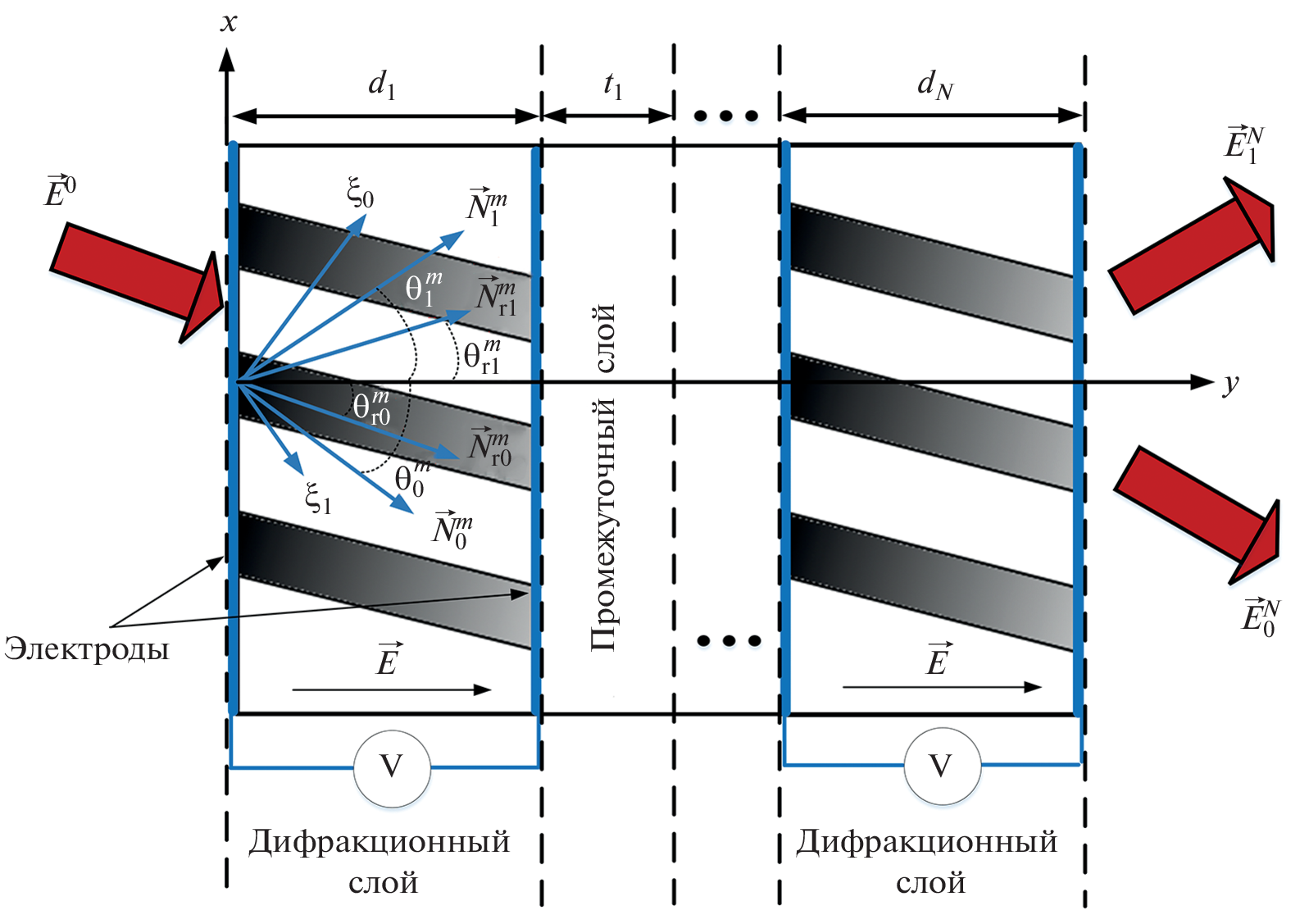 A new analytical model of diffraction of quasimonochromatic light beams on spatially inhomogeneous multilayer diffraction structures formed in photopolymer material with nematic liquid crystals having smooth optical inhomogeneity in the thickness of layers is presented. It is shown that when an applied electric field isapplied to diffraction layers containing a photopolymer composition with a high proportion of liquid crystalline component, a transformation of the selective response with a significant shift in angular selectivity occurs