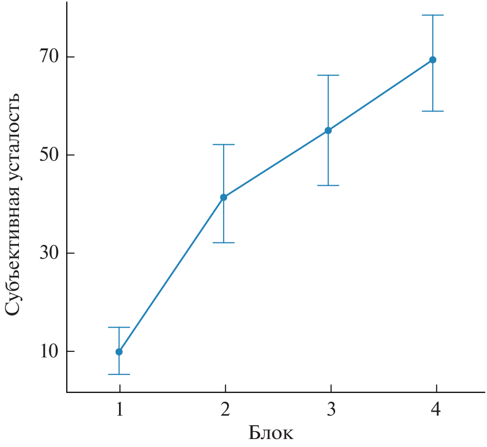 We studied physiological and behavioral characteristics of a person during prolonged solution of a cognitive task based on Sternberg paradigm. We found that evaluation of subjective fatigue and physiological characteristics such as blink duration and pupil size range of motion during the task solution are correlated to each other.