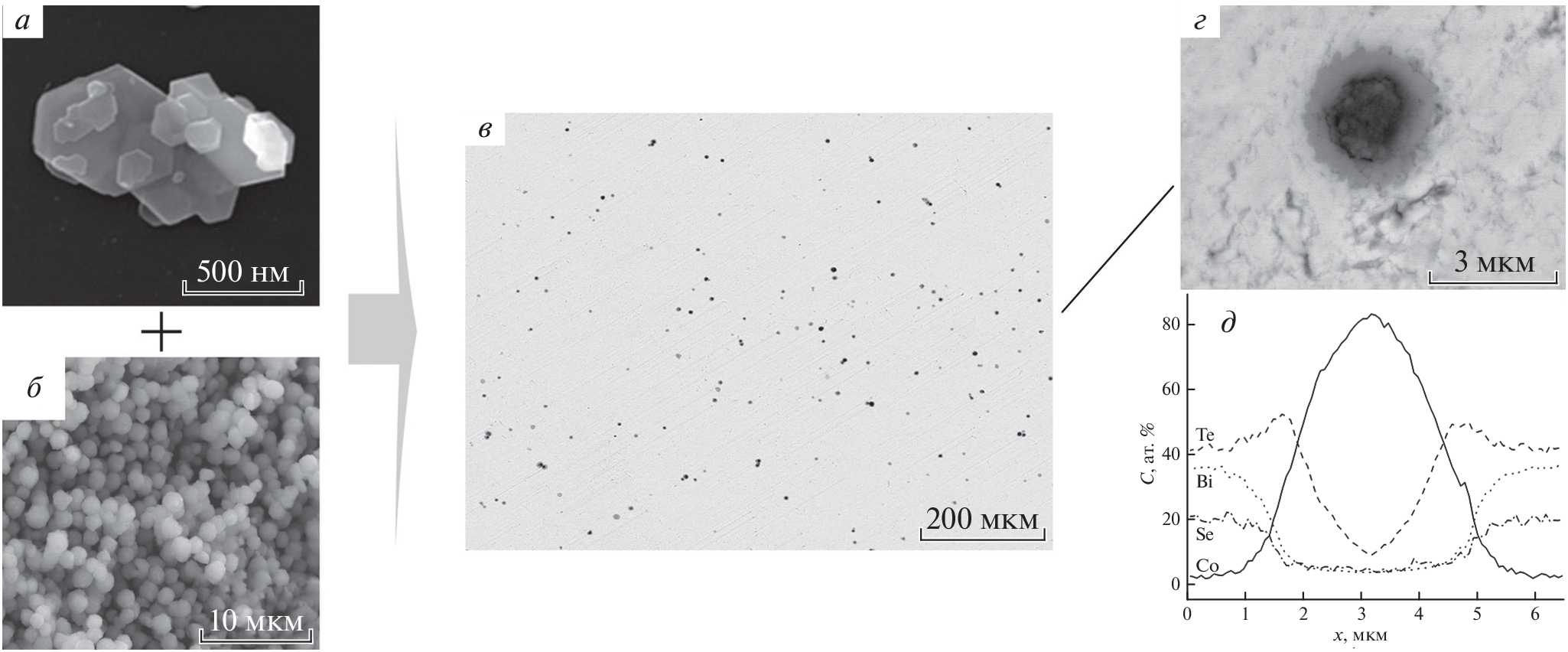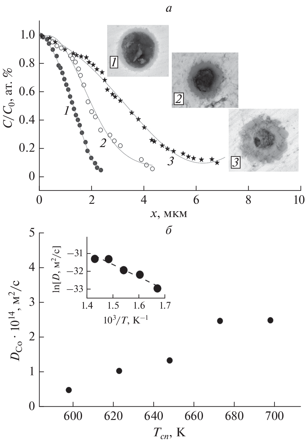 Effect of spark plasma sintering temperature on the formation of Co filler particles in the Bi2Te2.1Se0.9 matrix has been examined. Owing to high-temperature diffusion redistribution of atoms in the matrix and filler materials and chemical interaction between these materials, in the Bi2Te2.1Se0.9 + 0.33 wt % Co, core–shell filler particles (Co@CoTe2) are formed. With increasing the sintering temperature, fraction of the “CoTe2 shell” in the particles increases, while fraction of the “Co core” decreases. This behavior is due to an increasing in the diffusion coefficient of Co in the Bi2Te2.1Se0.9 matrix with increasing in the sintering temperature. The concentration profiles of the Co distribution of in the Bi2Te2.1Se0.9 matrix, governed by diffusion, are well described using Fick’s second law for diffusion from a limited source of a diffusing substance. The diffusion coefficient of Co increases with increasing un the sintering temperature in accordance with the Arrhenius law and with an activation energy of ~0.61 eV.