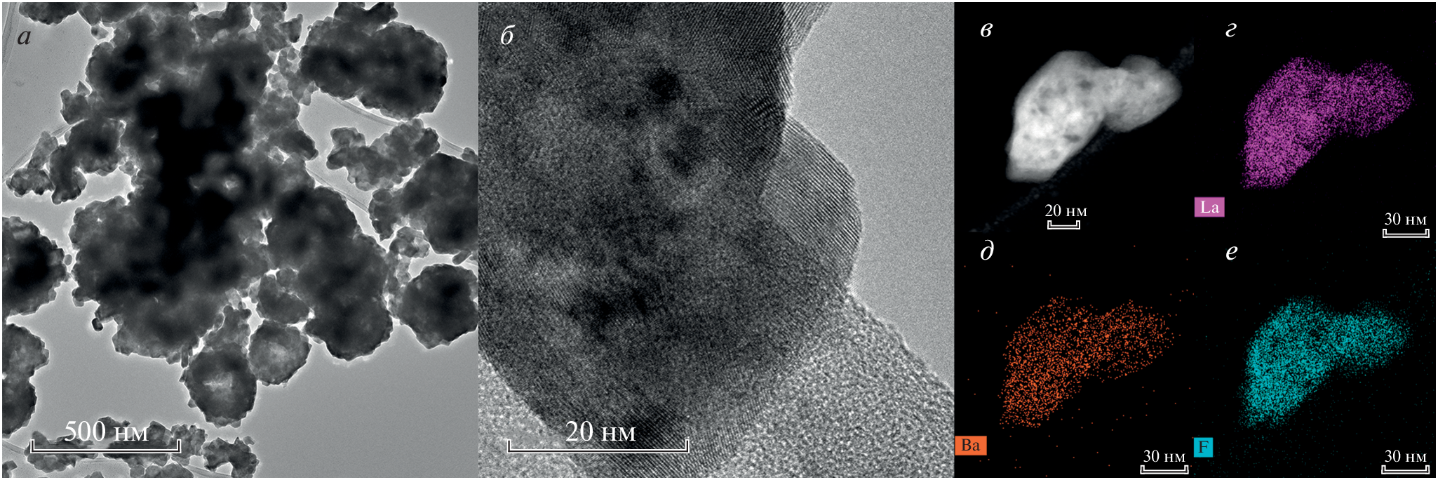 Nanopowders of tysonite solid solutions La1 – xBaxF3 – x (х = 0–0.07) were synthesized for the first time by thermal decomposition of lanthanum and barium trifluoroacetates. The samples obtained were characterized by electron microscopy, X-ray phase analysis, and impedance spectroscopy. Nanoparticles are crystalline and have characteristic sizes of 20–75 nm. The ionic conductivity of solid solutions in the range up to 300°C is determined by surface phenomena at the particle boundaries.
