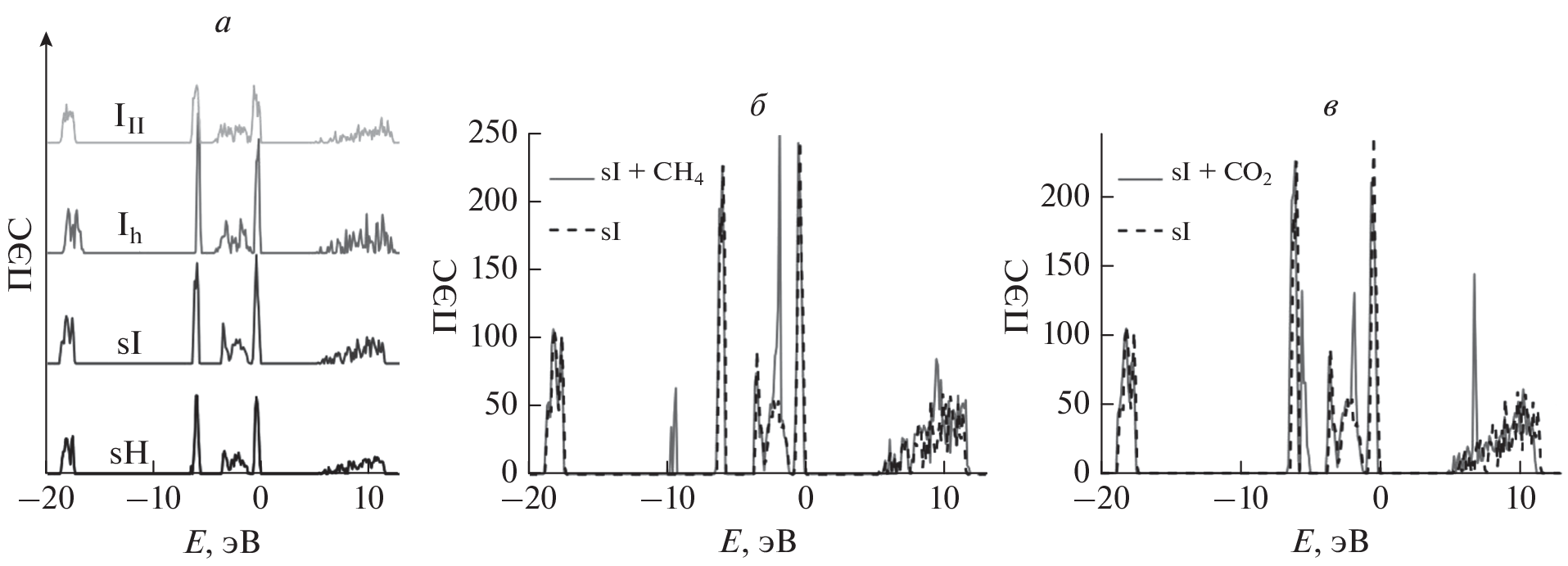 Для решеток газовых гидратов со структурой sI и sH, а также для льдов Ih и III проведены расчеты диэлектрических тензоров εik(ω), оптических спектров поглощения R(ω) и отражения a(ω), а также плотности электронных состояний N(E). Рассмотрена зависимость диэлектрической проницаемости от типа гостевых молекул в гидрате sI.