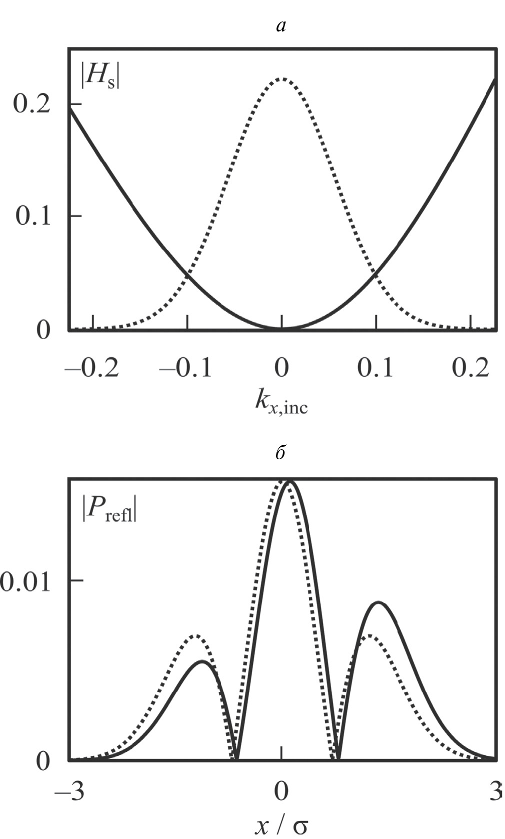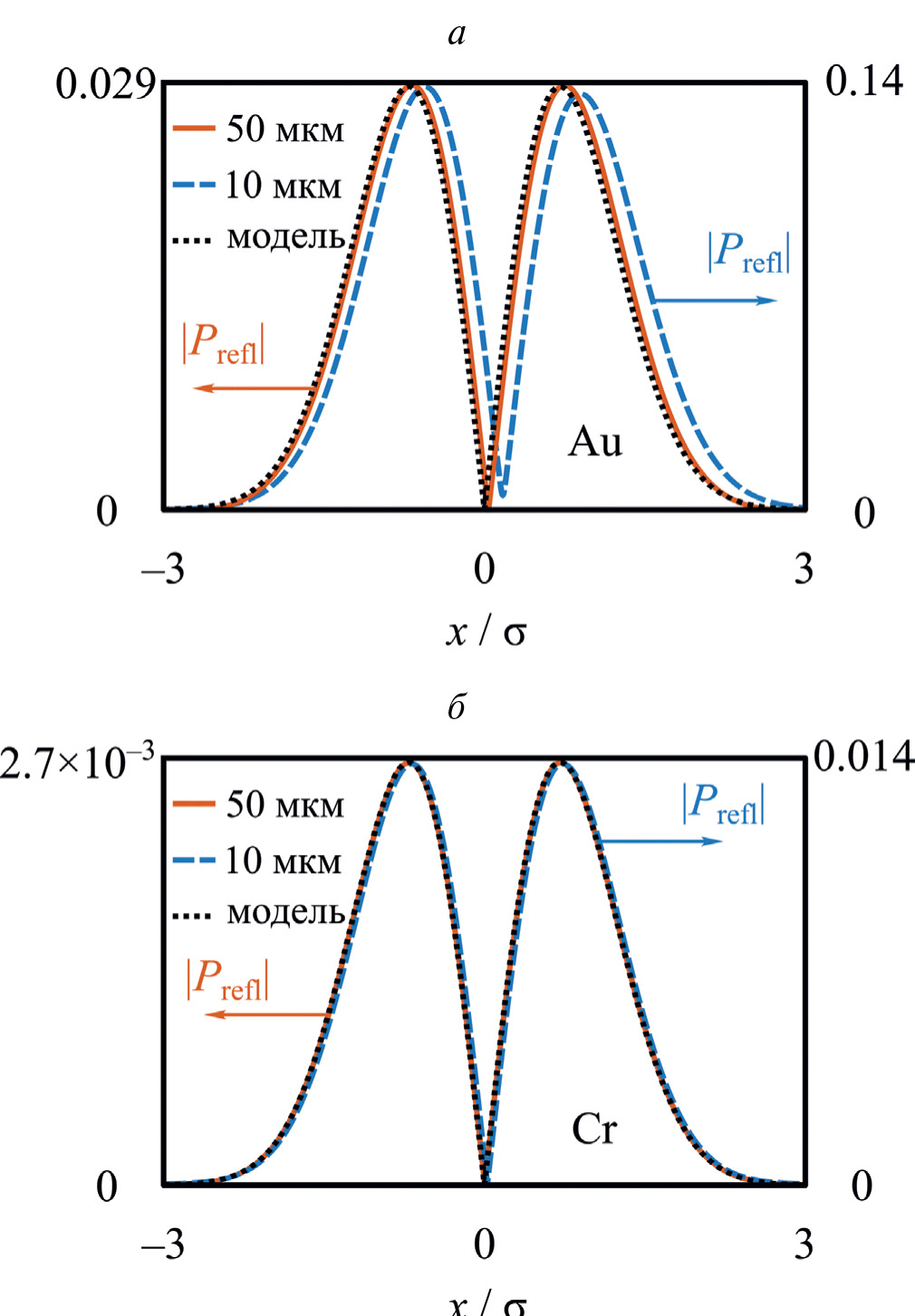 Рис. 2. Профили пучков при ширине σ = 10 мкм (пунктирная синяя линия) и σ = 50 мкм (сплошная линия), отраженных от интегральной МДМ-структуры с металлическими полосами из золота (а) и хрома (б); аналитическая функция, соответствующая производной (9) (пунктирная черная линия).
