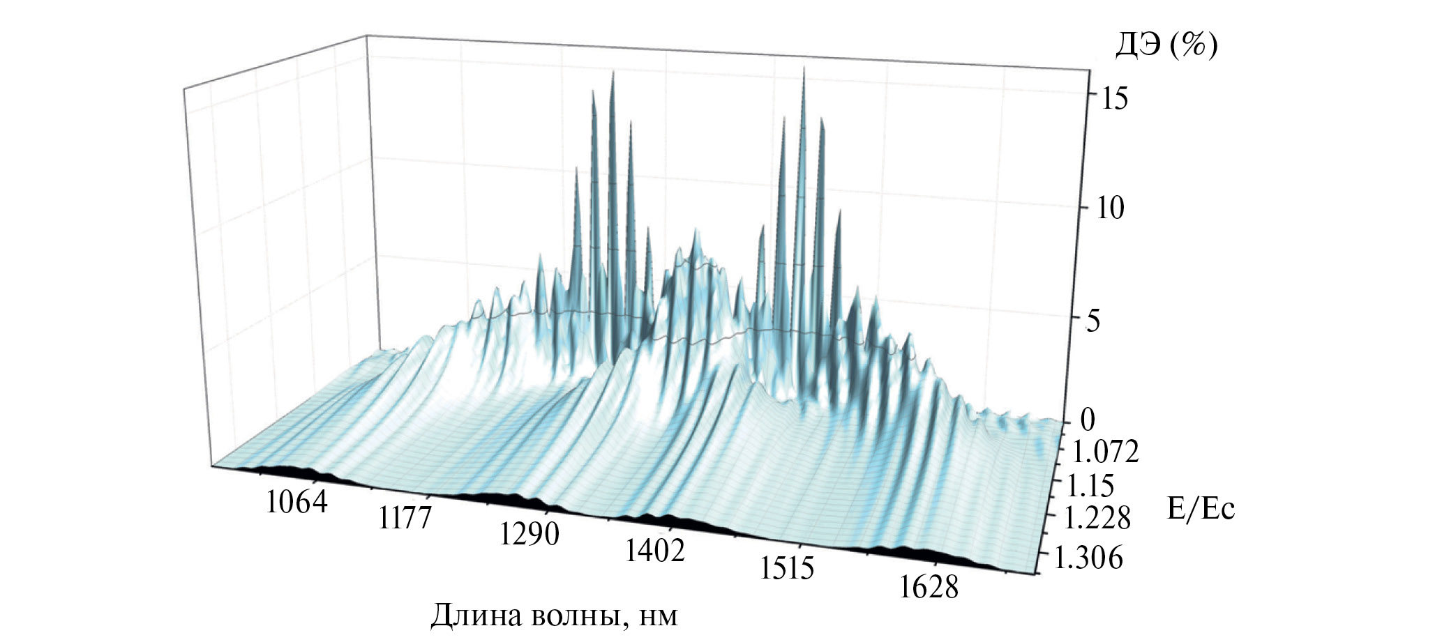 Для случая с одинаковой полярностью (рис. 4) сам вид угловой селективности не изменяется, и спектральная полоса пропускания может быть также увеличена до 4 раз по сравнению с обычной МНГДС без эффекта трансформации. Следовательно, при правильном подборе углов записи для дифракционных структур и угле поляризации считывающего излучения можно получить угловую селективность МНГДС, где разница значения ДЭ для локальных максимумов будет не ниже уровня минус 3 дБ. Данную особенность можно рассматривать в качестве инструмента по динамическому увеличению как числа спектральных каналов, так и выравниванию их уровня по интенсивности.