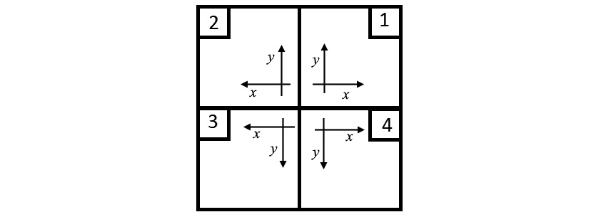 Мультиплексная система строилась из набора ячеек, в центре которых располагался парциальный пучок с винтовой дислокацией волнового фронта. На рис. 1 приведен фрагмент из четырех соседних ячеек. Для того чтобы на границах ячеек приравнять значения фазы пучков, направление поперечных координат x, y в соседних ячейках изменялось (см. рис. 1).