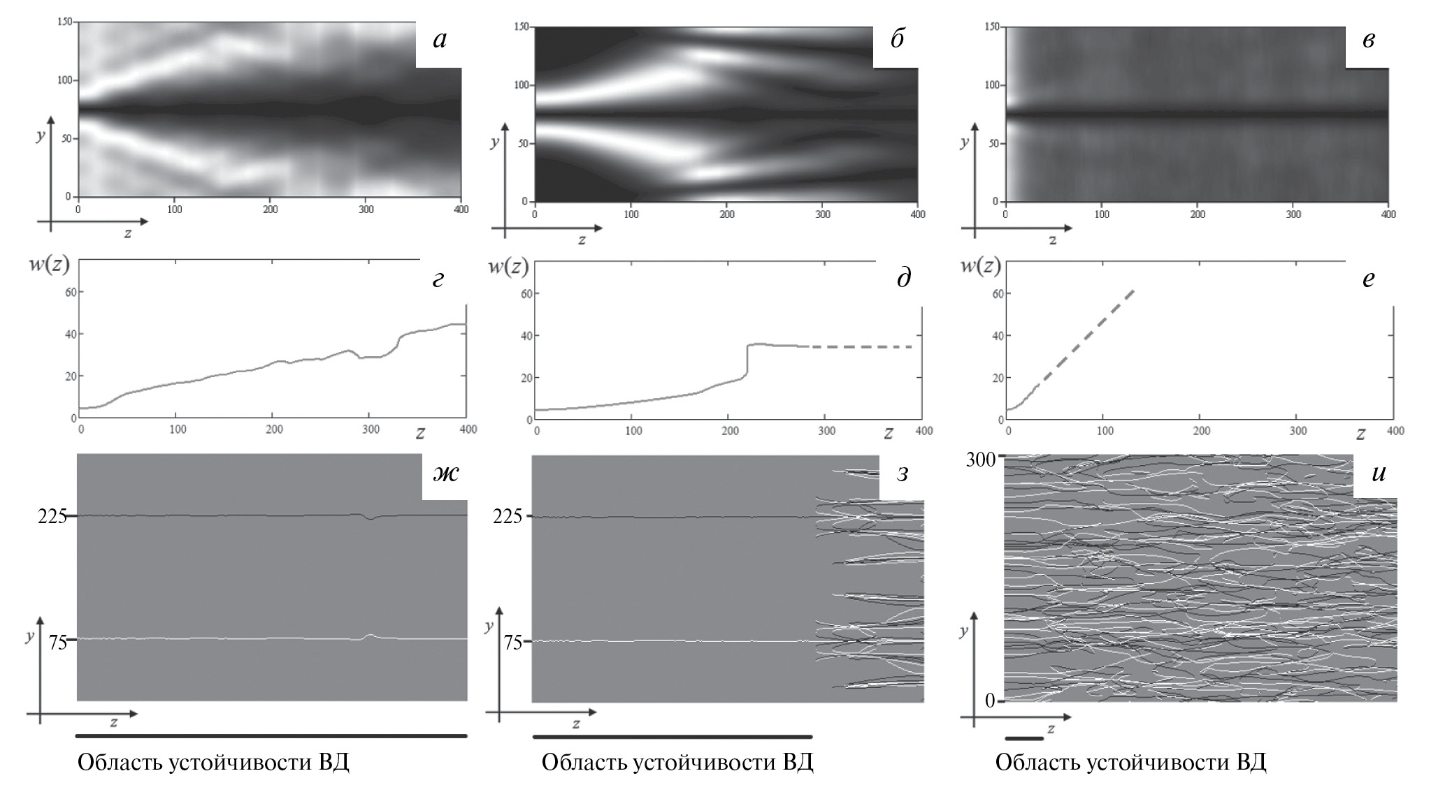 Рис. 3. Характеристики мультиплексов I–III: характеристики мультиплекса I (а, г, ж); характеристики мультиплекса II (б, д, з); характеристики мультиплекса III (в, е, и); продольные распределения интенсивности в градациях серого (а, б, в); изменения размеров дислокаций w (г, д, е); траектории перемещения дислокационных образований (ж, з, и); y, z — поперечная и продольная координаты.