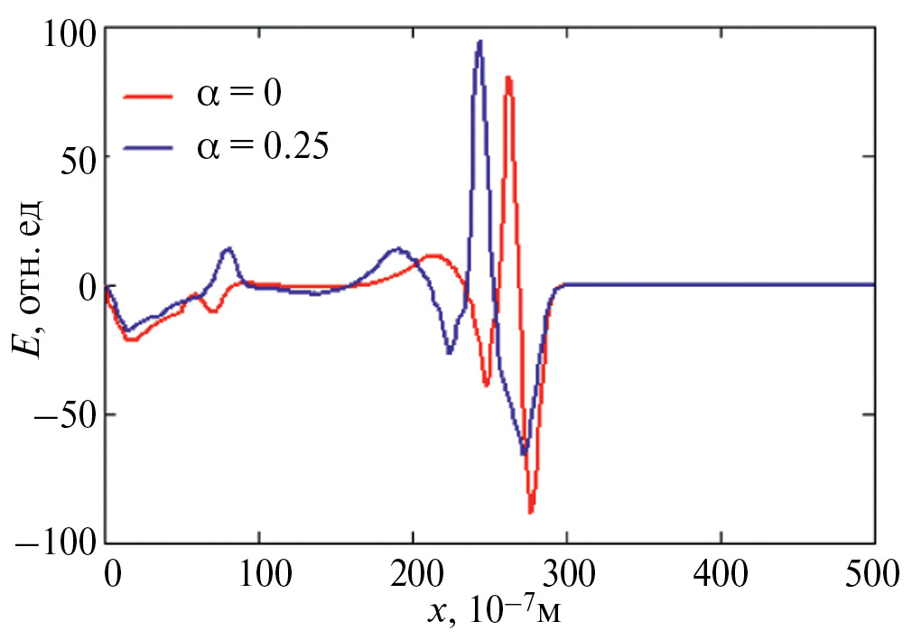 Рис. 1. Зависимость напряженности электрического поля ПКИ от координаты в фиксированный момент времени 10 пс при распространении в среде УНТ: в отсутствие ФК (красная линия), в присутствии ФК (синяя линия).