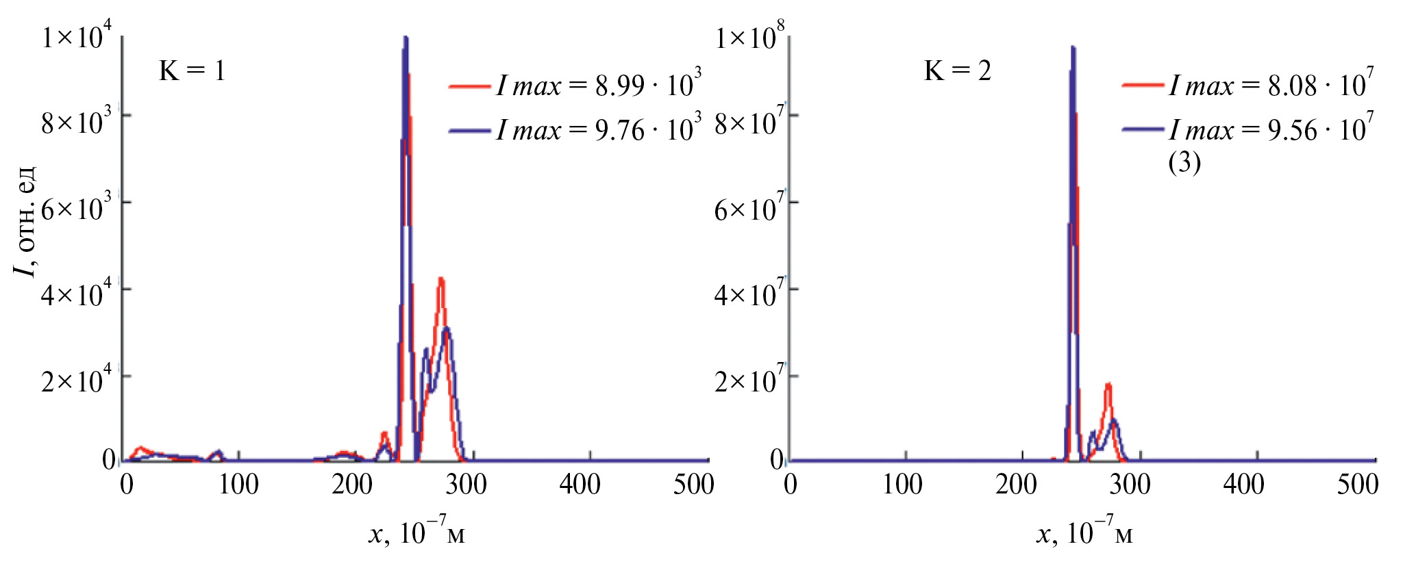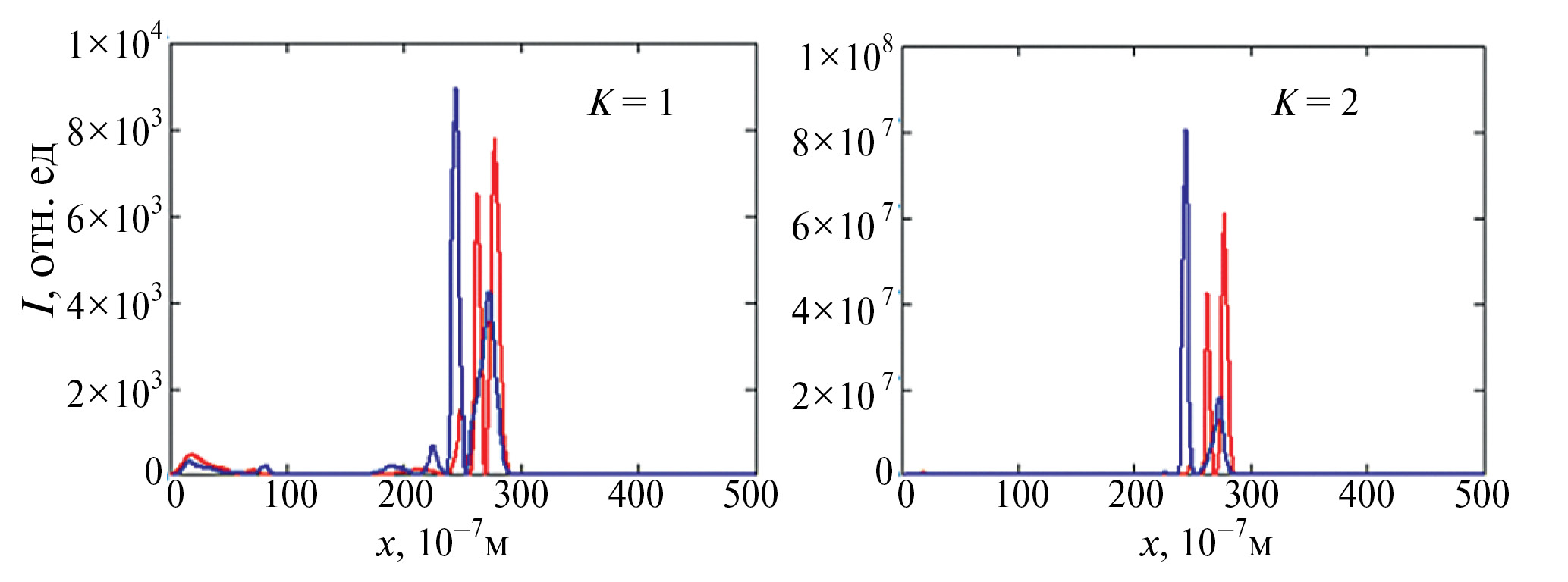 Рис. 2. Зависимость интенсивности ПКИ при однофотонной (слева) и двухфотонной (справа) ионизации в однородной среде УНТ без модуляции показателя преломления (красная линия) и с ней (синяя линия).