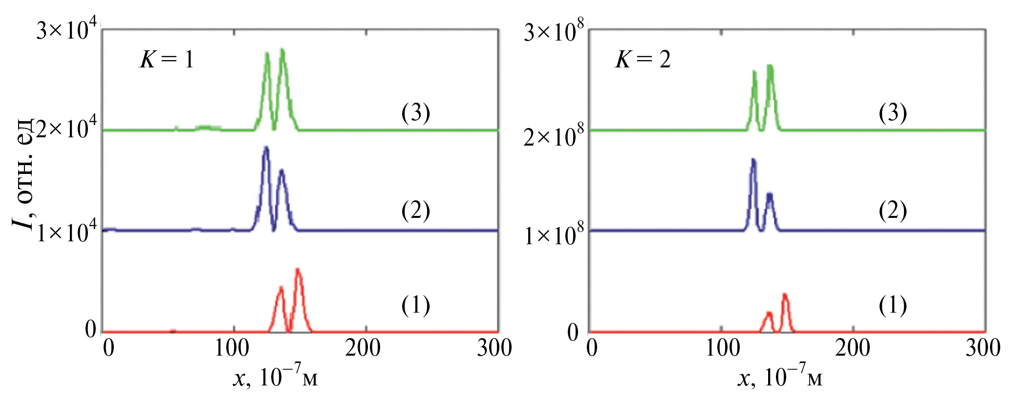 Рис. 3. Зависимость интенсивности ПКИ при однофотонной (слева) и двухфотонной (справа) ионизации (1) – без ФК, (2) – в присутствии ФК при действии внешнего электрического поля, (3) – в присутствии ФК в отсутствие внешнего электрического поля.