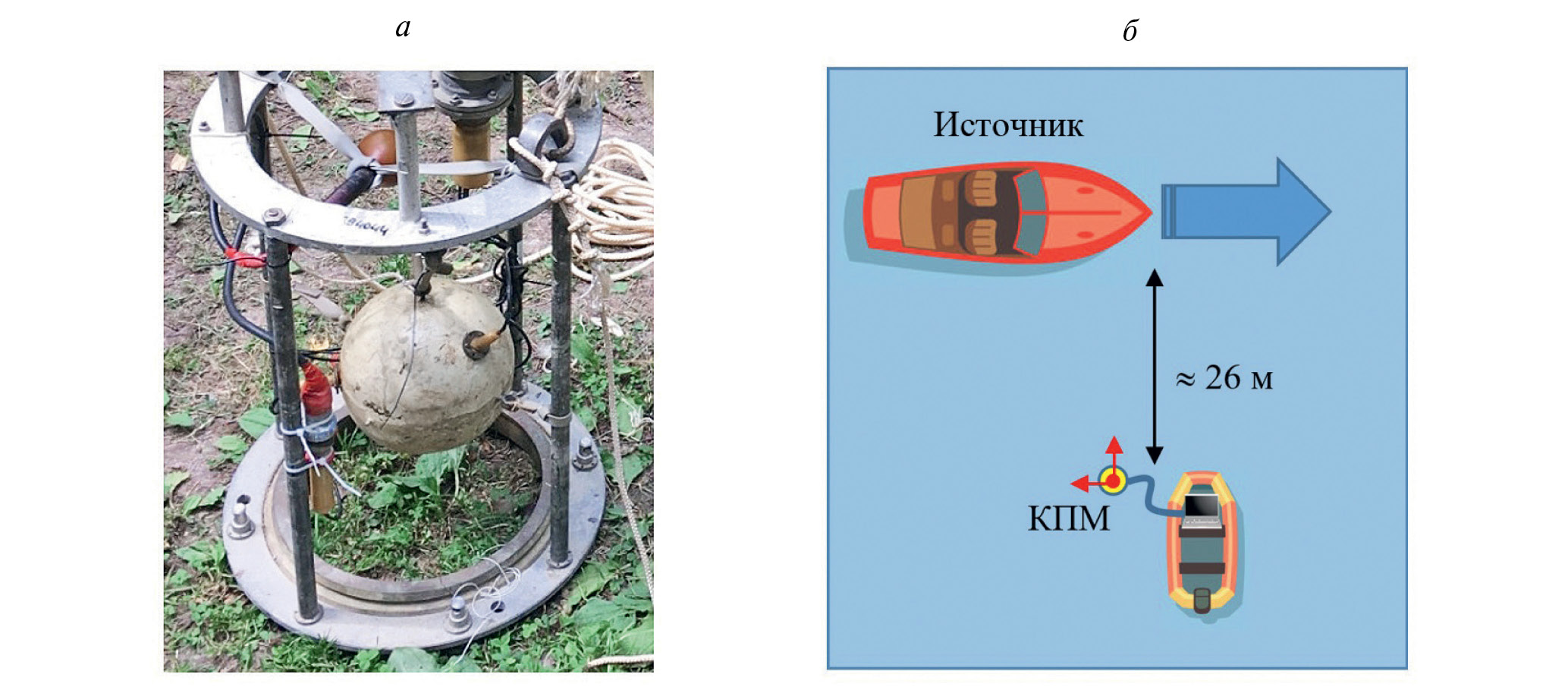 Рис. 2. Использованный в эксперименте комбинированный приемный модуль (КПМ) (а); условная схема проведенных измерений на гидроакустическом полигоне МГУ с движущимся катером (б).