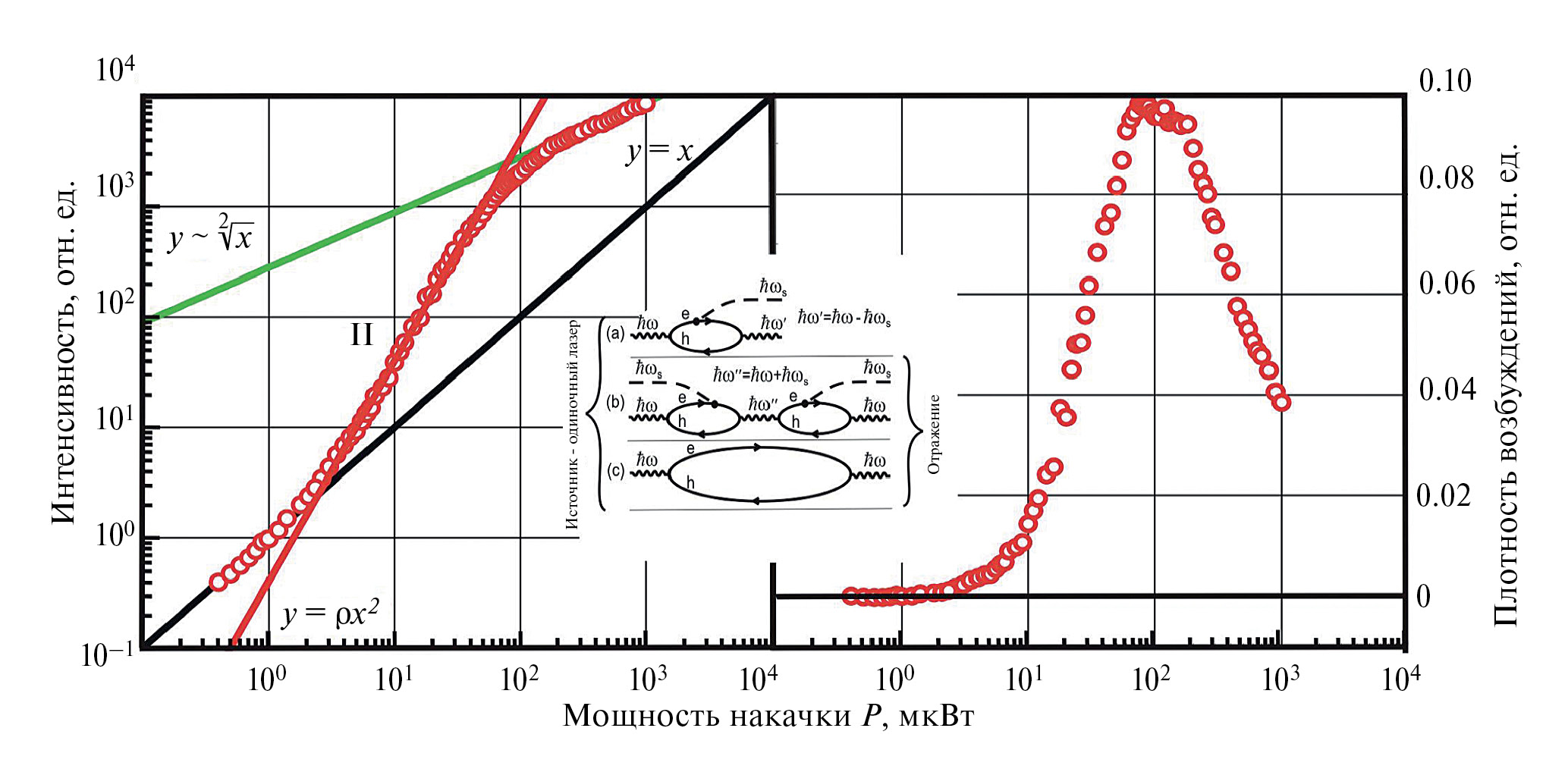 Рис. 1. Интенсивность сигнала упругого обратного рассеяния света в зависимости от мощности лазерного возбуждения (точки; слева). Интенсивность сигнала нормирована на коэффициент пропорциональности α из уравнения (1). Зеленая, черная и красная линии – корневая, линейная и квадратичная функции мощности возбуждения, соответственно. Оценочная плотность спин-магнитогравитонов в лафлиновской жидкости (в долях от плотности электронов) в зависимости от мощности возбуждения, полученная из зависимости слева, как n ~ I/(αP)–1 (справа). На вставке приведена схема трех оптических процессов: (а) – спонтанное стоксовое рамановское рассеяние света; (b) – когерентное антистоксовое-стоксовое рамановское рассеяние света (аССР); (c) – резонансное упругое обратное рассеяние света