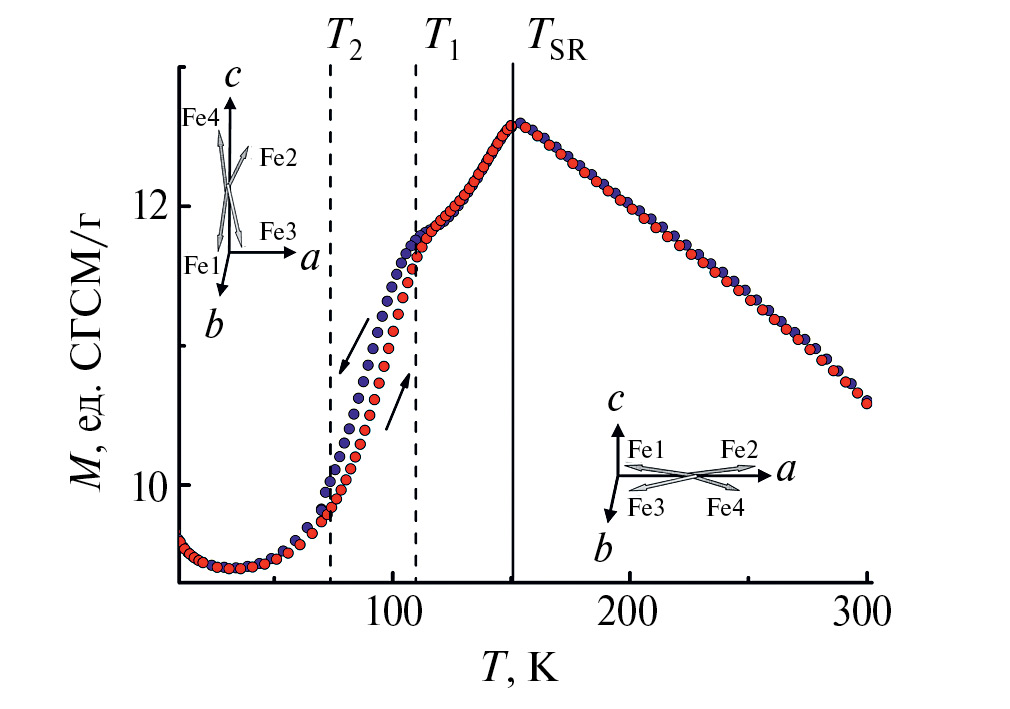 Рис. 1. Температурные зависимости намагниченности наночастиц ε-In0.04Fe1.96O3, измеренные при охлаждении (синие символы) и нагревании (красные символы). Сплошной вертикальной линией обозначена температура спин-переориентационного перехода TSR = 150 К. Пунктирными вертикальными линиями обозначены температуры T1 и T2, соответствующие области метастабильного состояния сосуществования обеих фаз. Стрелками указаны направления изменения температуры. На врезках схематически изображены направления намагниченности каждой из подрешеток железа относительно кристаллографических осей в каждой из фаз