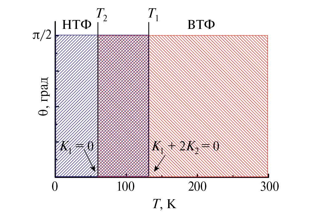 К настоящему времени наблюдаемый магнитный фазовый переход из высокотемпературной фазы (ВТФ) с высоким значением намагниченности в низкотемпературную фазу (НТФ) с низким значением намагниченности был описан в рамках различных подходов и приближений [11, 13, 17]. Ключевым из них является магнитодинамический подход, согласно которому наблюдаемый магнитный фазовый переход есть спин-переориентационный переход. Этот переход характеризуются тем, что при изменении температуры, меняется ориентация намагниченности относительно кристаллографических осей (осей легкого намагничивания). В общем случае имеют место быть три возможные фазы. Две коллинеарные фазы с θ = 0, π, K1 ≥ 0 (ВТФ) и θ = π/2, 3π/2, K1 + 2K2 ≤ 0 (НТФ) с анизотропией типа легкая ось и легкая плоскость, соответственно [18]. И угловая фаза с sin2θ = – K1/2K2, K1 < 0 и K1 + 2K2 ≥ 0 c анизотропией типа конус осей легкого намагничивания [18]. Здесь θ – угол, задающий ориентацию вектора намагниченности в кристалле, K1 и K2 – первая и вторая константы магнитной анизотропии. Если при изменении температуры K1 изменяет знак, а K2 > 0, то в кристалле могут существовать обе коллинеарные фазы и угловая фаза. Спиновая переориентация происходит в виде двух фазовых переходов второго рода. При K2 < 0 угловая фаза является неустойчивой, и температурные области существования коллинеарных фаз перекрываются (рис. 2).