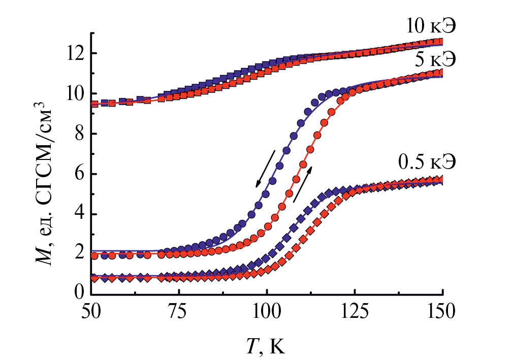 На рис. 1 представлены температурные зависимости намагниченности наночастиц ε-In0.04Fe1.96O3, измеренные в режиме охлаждения и нагревания. При понижении температуры наблюдается рост намагниченности, который сменяется резким падением при температуре TSR = 150 К. В сравнительно узком интервале температур Т = 75–150 К намагниченность образца уменьшается почти до нуля (рис. 1). При повышении температуры образец принимает исходное значение намагниченности при более высоких температурах, т.е. наблюдается температурный гистерезис. Гистерезисные явления, сопровождающие образование зародышей другой фазы и протекание фазовых превращений с конечной скоростью, характерны для фазовых переходов первого рода. Интервал температур Т = 75–125 К, где наблюдается температурный гистерезис, соответствует области сосуществования метастабильных состояний. Зародышами новой фазы обычно служат доменные стенки, так как в них всегда имеются участки, в которых направление намагниченности совпадает с таковым в новой фазе.