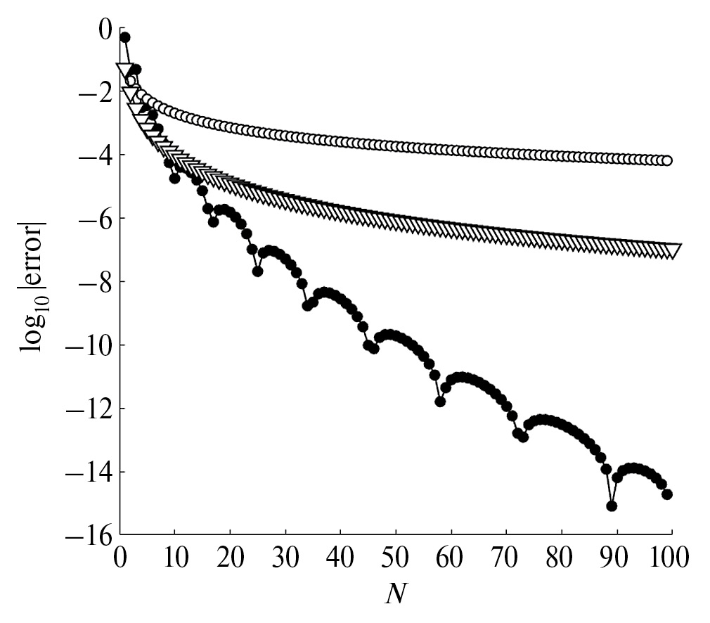 На рис. 2 показаны графики сходимости разных квадратур в полулогарифмическом масштабе. Здесь светлыми кружками обозначена погрешность обыкновенной формулы средних. Темные кружки соответствуют погрешности формулы средних с заменой переменных (10). Треугольники – погрешность квадратуры Гаусса–Кристоффеля.