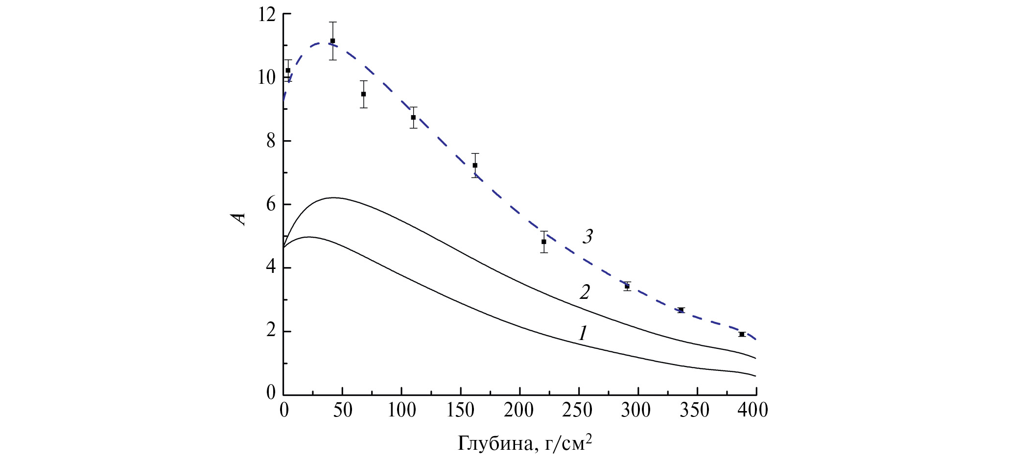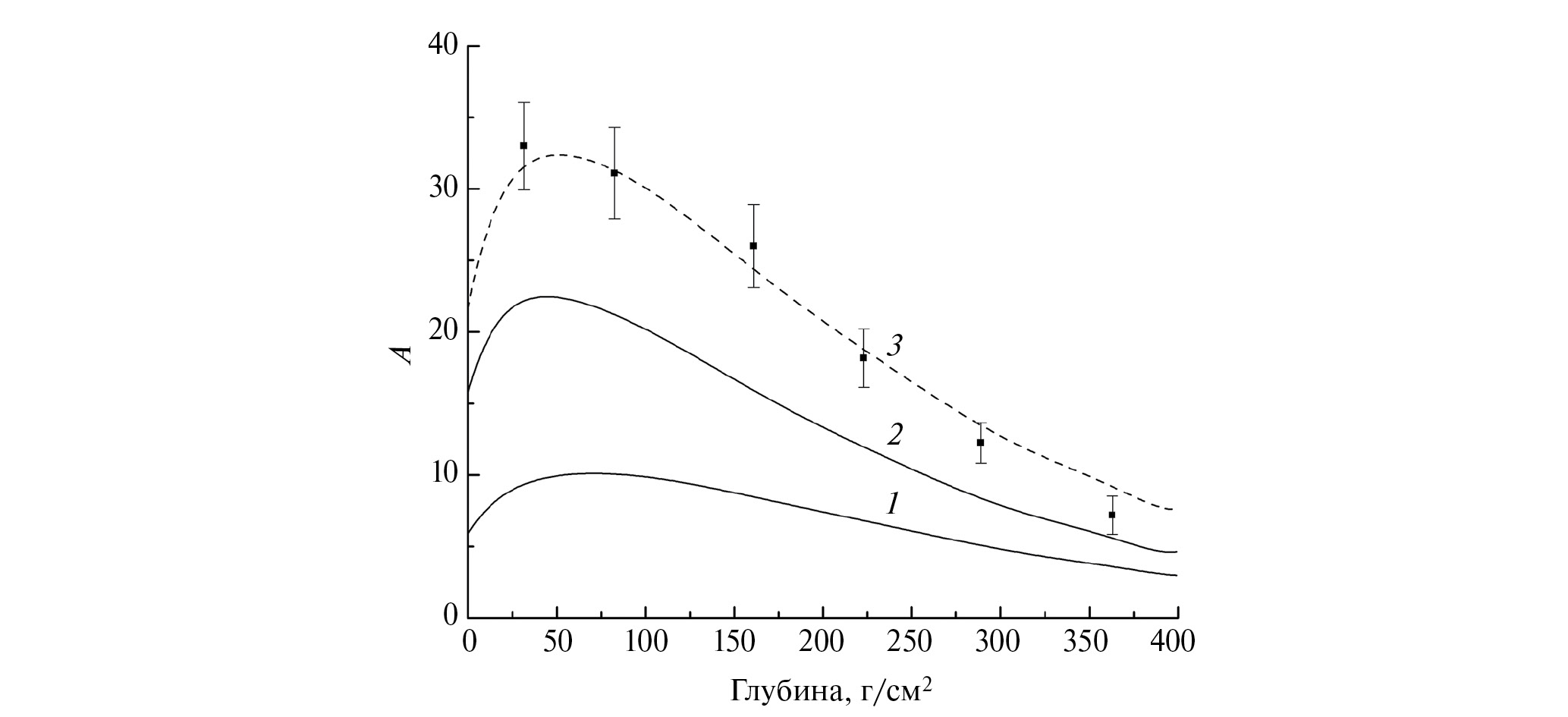 Рис. 1. Глубинные профили наведенной активности (A, число распадов в мин. на кг) 10Ве: точки – экспериментальные данные [1], 1 – от ГКЛ, 2 – от вспышки сверхновой, 3 – сумма