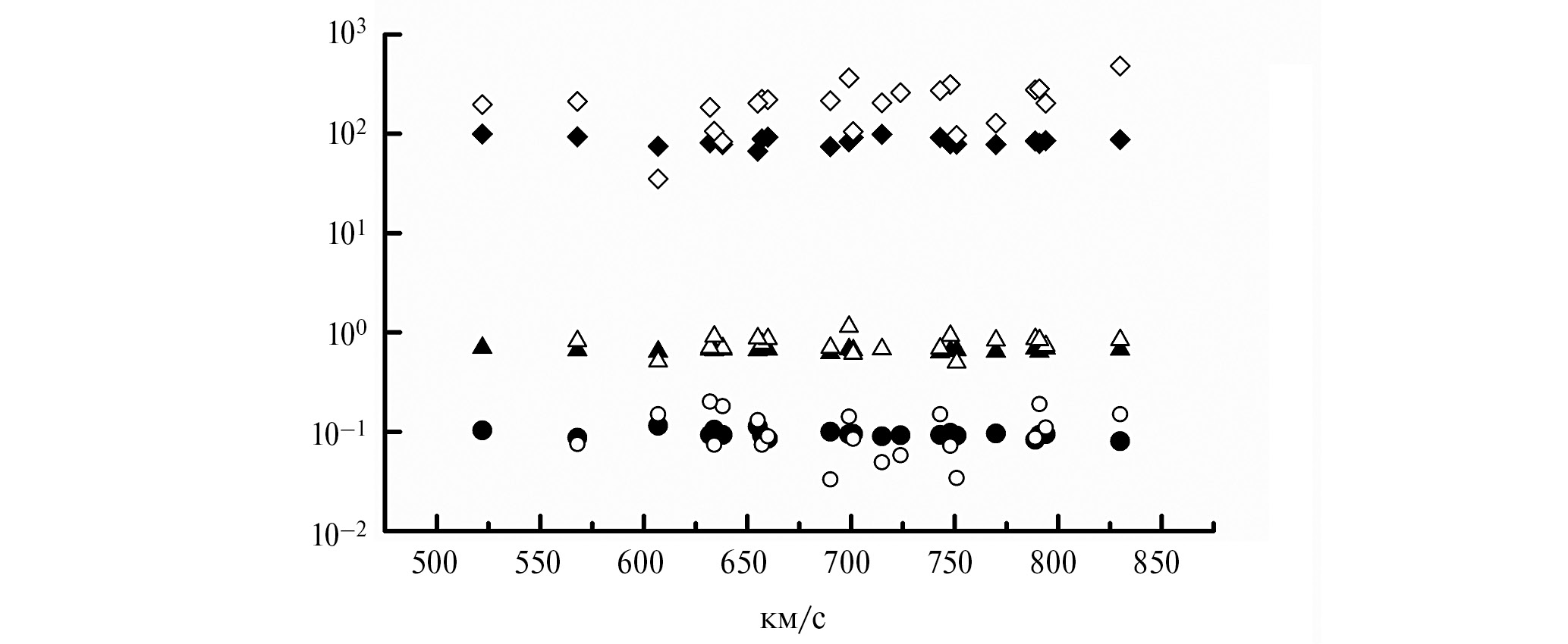 Рис. 1. Относительное содержание тепловых ионов солнечного ветра He/O (сплошные ромбы), C/O (сплошные треугольники) и Fe/O (сплошные кружки) и надтепловых ионов He/O (серые ромбы), C/O (пустые треугольники) и Fe/O (пустые кружки) с энергиями 0.04‒0.08 МэВ/нуклон в потоках частиц из долгоживущей КД СН1 [12] на 29 оборотах Солнца с начала ее существования (38 оборотов Солнца) в зависимости от максимальной скорости солнечного ветра из этой КД, по данным [14]