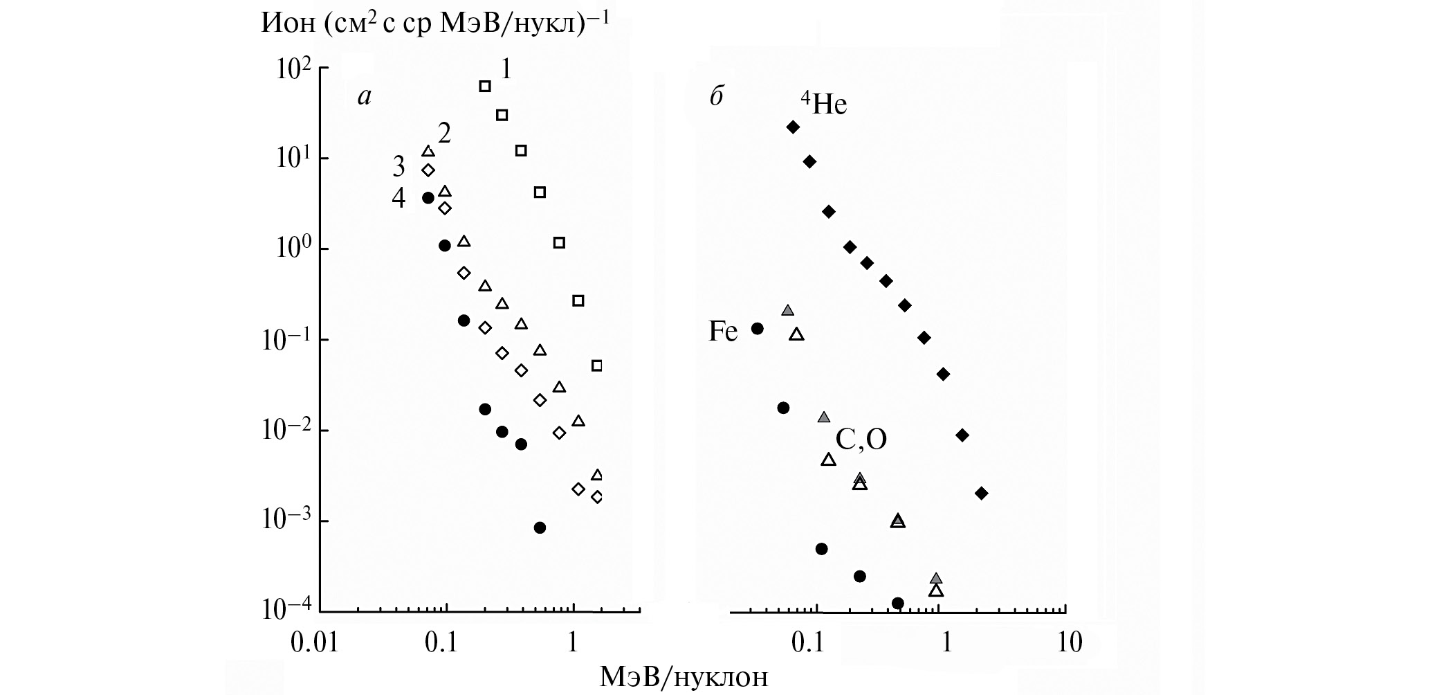 Рис. 2. Энергетические спектры надтепловых ионов 4Не, ускоренных в рекуррентных потоках частиц из изучаемой здесь долгоживущей КД СН1 [12] (а) на четырех разных оборотах ее существования: 1) № 19 18–19/12/2007, 2) № 15 3/9/2007, 3) № 14 7/8/2007, 4) № 12 14–15/6/2007. Энергетические спектры надтепловых ионов 4Не (ромбы), С (серые треугольники), О (пустые треугольники) и Fe (черные кружки) в потоках ионов из КД на 14-м обороте существования CH2 [12] (б), наблюдавшихся 15–16.08.2008