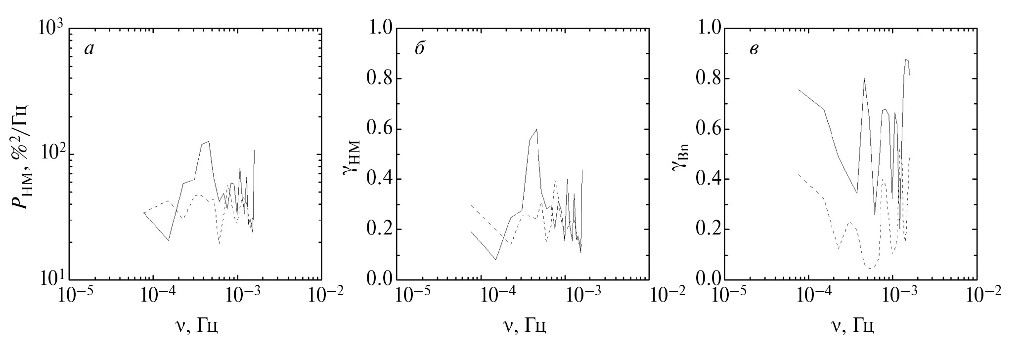 Рис. 2. Кросс-спектры флуктуаций КЛ, определенные по данным станций Якутск и Бухта Тикси (а), коэффициенты когерентности флуктуаций КЛ (б) и коэффициенты когерентности между величиной модуля ММП и плотностью плазмы СВ (в). Пунктир соответствует времени за более чем 1 сут до прихода МУВ (с 1 ноября 10:41 UT по 2 ноября 10:40 UT), сплошные линии – интервалу времени 2 ноября 15:31 UT ‒ 3 ноября 15:31 UT перед приходом МУВ на КА WIND3 ноября 19:54 UT