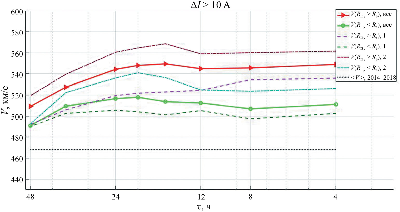 На рис. 1 представлена зависимость V от времени осреднения τ для интервалов с надпороговой амплитудой ГИТ при высоких и низких значениях отношения RIB. В интервале τ от 4 до 12 ч значения V составляют около 545 км/с для RIB > Rb и ~510 км/с для RIB < Rb, т.е. отличие составляет 35 км/с. Большие значения скорости для более ГИТ-эффективных пульсаций с разницей около 35 км/с сохраняются и для каждого из двухлетних интервалов. При этом для интервала 1 вблизи максимума солнечного цикла надпороговые амплитуды ГИТ наблюдаются при меньших скоростях солнечного ветра (535 и 500 км/с для ГИТ-эффективных и неэффективных пульсаций), чем для интервала 2 на фазе спада солнечного цикла (560 и 525 км/с). Почти постоянное значение скорости наблюдается при времени осреднения τ < 8 ч, а существенное уменьшение влияния скорости на амплитуду ГИТ и на отношение RIB — при τ > 24 ч.