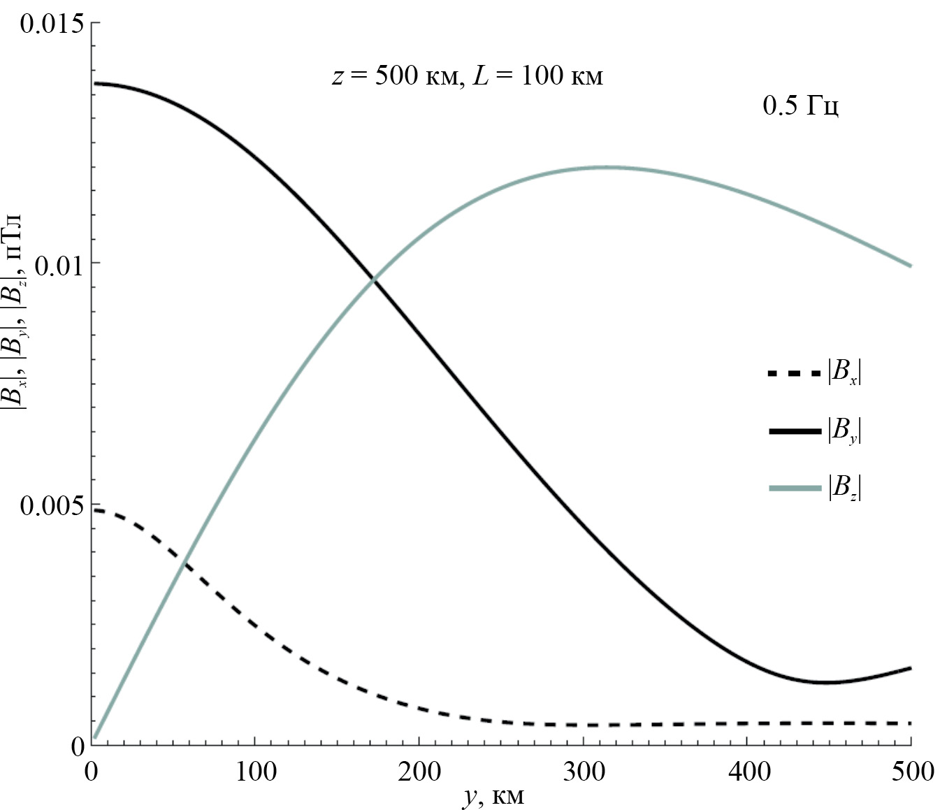 Рис. 4. Пространственная структура амплитуды магнитных компонент |Bx(y)|, |By(y)|, |Bz(y)| излучения системы FENICS в направлении поперек токовой линии на высоте 500 км. Проводимость Земли σg = 10–5 См/м, длина L = 100 км, частота — 0.5 Гц