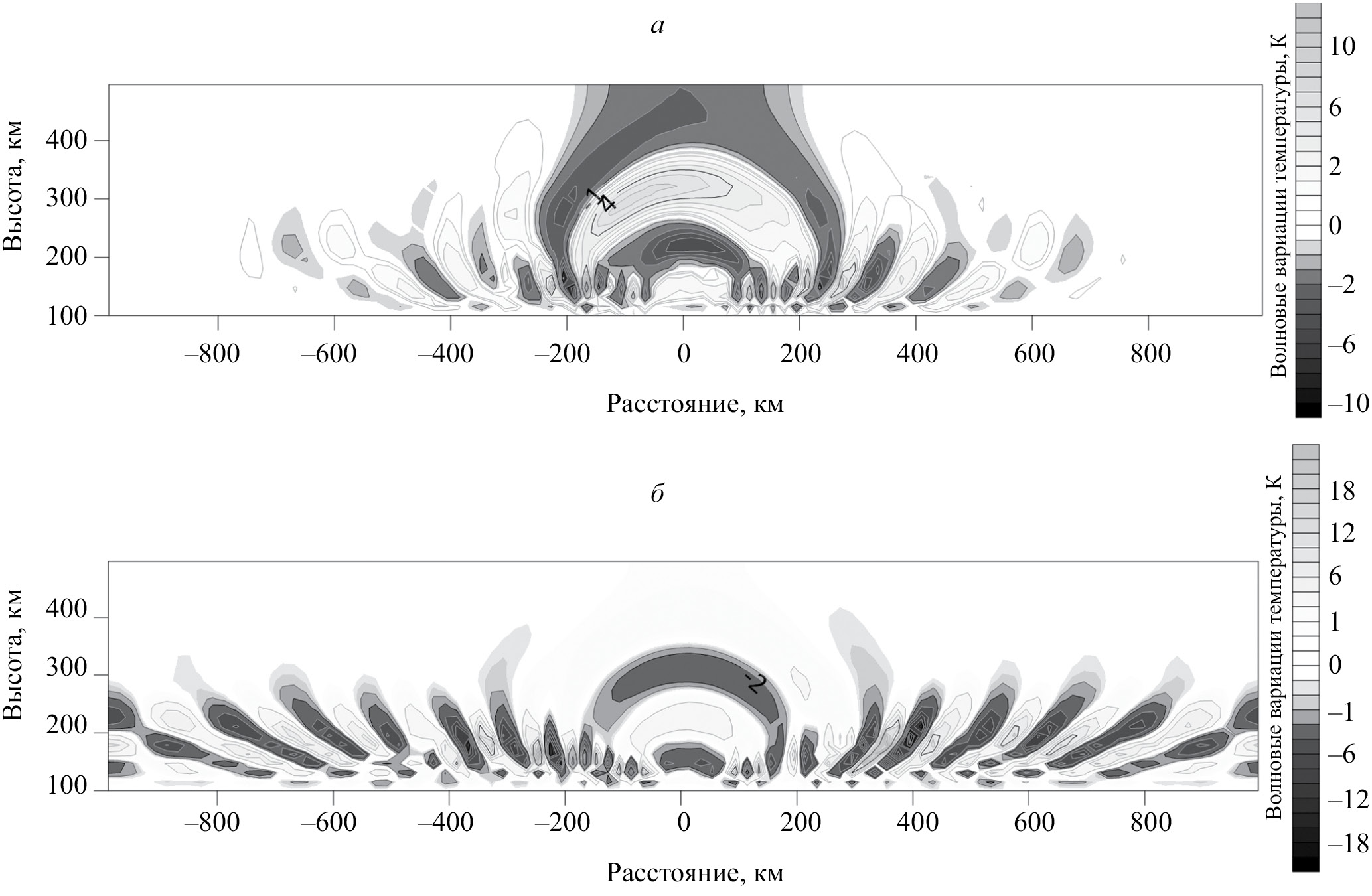 Трехмерный численный расчет распространения волн (рис. 2), генерируемых сильным метеорологическим явлением, показал, что температурные возмущения в термосфере над областью метеорологического возмущения в нижних слоях атмосферы проявляют себя достаточно быстро уже через ~0.5 ч после начала работы источника. Эффекты, создаваемые волнами на термосферных высотах, сильно изменяются уже через 1 ч после начала работы тропосферного источника. Вертикальный и горизонтальный масштабы волновых возмущений температуры в верхней атмосфере составляют около 400 км по вертикали и 200 км соответственно. Через 2 ч работы источника площадь возмущений в термосфере значительно превышает размеры области возмущений в нижних слоях атмосферы.