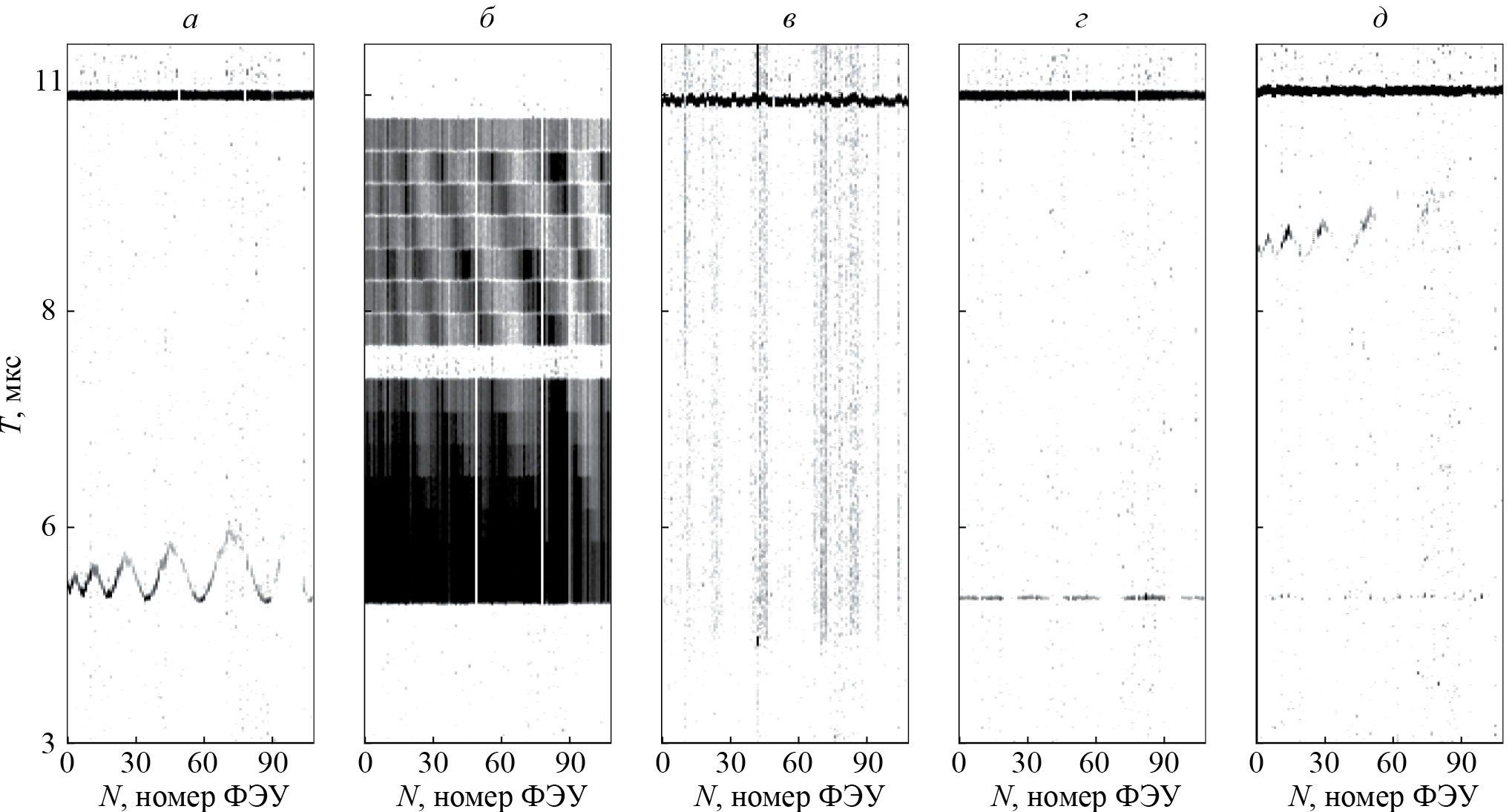 Рис. 1. Примеры событий различных типов, зарегистрированные в эксперименте СФЕРА-2: а — отраженный черенковский свет ШАЛ; б — калибровочное событие; в — “длительное” шумовое событие; г — “короткое” шумовое событие; д — событие с прямым и отраженным черенковским светом