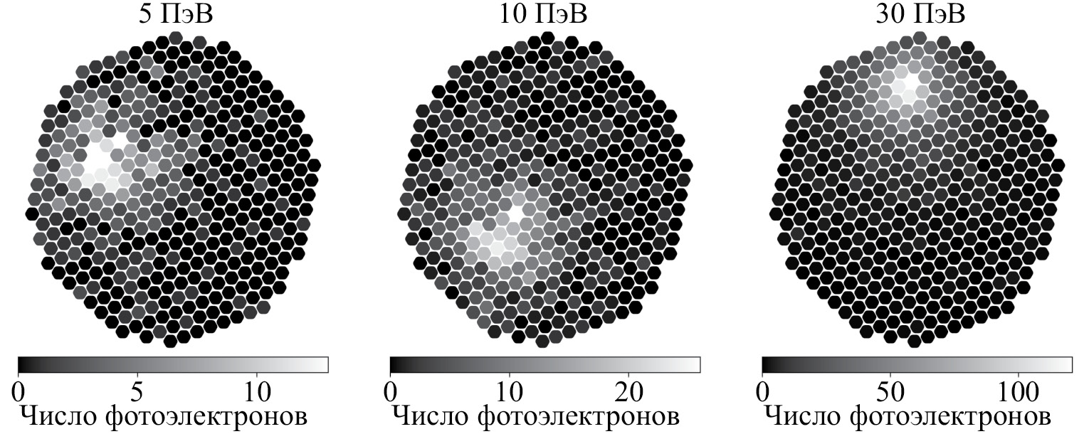 Рис. 4. Рассчитанные распределения черенковских фотонов на мозаике детектора СФЕРА-3 от первичного протона с энергиями 5, 10 и 30 ПэВ