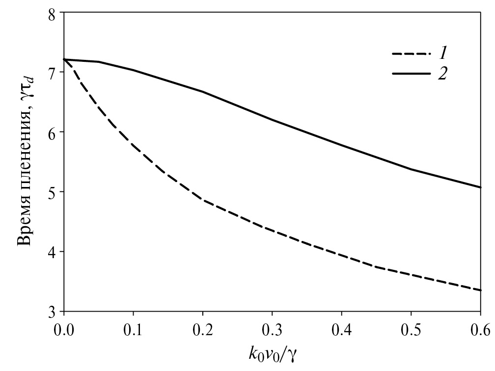 Роль дрейфа частоты усиливается при нагревании, что хорошо иллюстрируется рис. 3. На нем показана зависимость диффузионного времени пленения от наиболее вероятной скорости (температуры) для атомного облака размером k0L = 60 и содержащего N = 1080 атомов. Параметр вычислен для момента времени после окончания импульса возбуждения. Кривая 1 рассчитана для движущихся атомов, кривая 2 — результат модельного расчета. Для k0v0 = 0.5γ времена пленения различаются почти в полтора раза.
