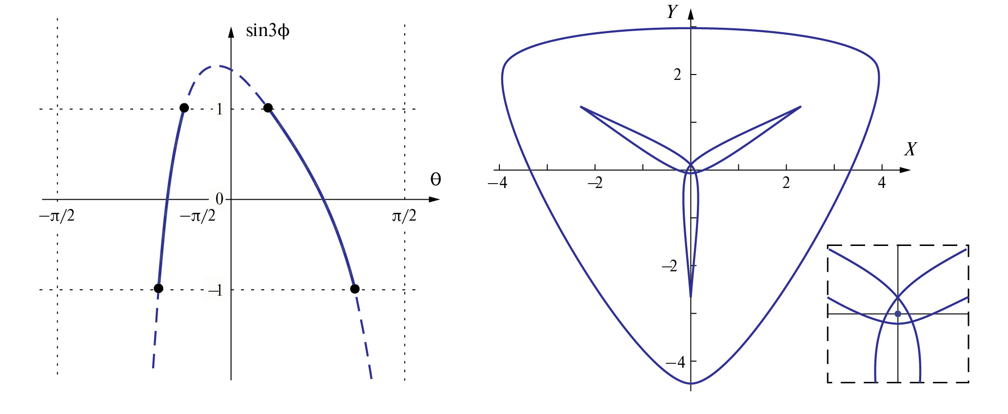 График функции от θ, находящейся в правой части этого уравнения, показан на рис. 1. Как видно из рисунка, только на двух интервалах, [−0.651; −0.418] и [0.339; 1.123], существует решение. Обозначим его как . Тогда общее решение — это объединение трех значений и трех значений . Если использовать эти шесть зависимостей φ(θ) при построении параметрической кривой, задаваемой первыми двумя уравнениями системы (13), то получится каустика, состоящая из двух частей: внутри — «трехлопастная» кривая с острыми вершинами, снаружи — гипоциклоида треугольного вида (см. рис. 1 справа). Отметим хорошее совпадение формы каустики, построенной на основе теории, с той, что будет получена далее в оптических экспериментах (рис. 4).