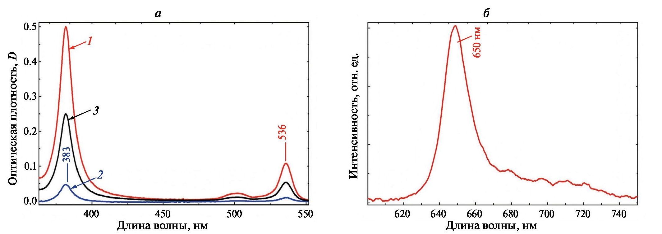 Рис. 2. Спектры поглощения для Pt-OEР в ТОЛ при различных оптических плотностях растворов (а) и спектр фосфоресценции Pt-ОЕР в TOЛ (λвозб = 382 нм) (б) при атмосферной концентрации кислорода и 293 К