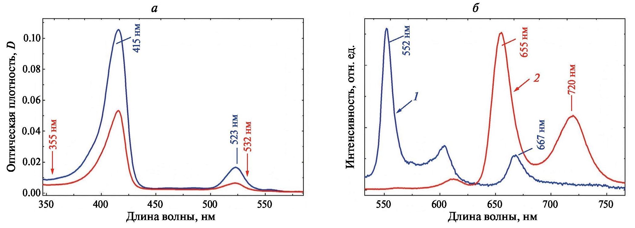 Рис. 3. Спектры поглощения Pd-ТРР (а) в ДХМ при различных оптических плотностях растворов, а также спектры флуоресценции и фосфоресценции (б) Pd-ОЕР в TOЛ (1) и Pd-ТРР в ДХМ (2) при атмосферной концентрации кислорода и 293 К