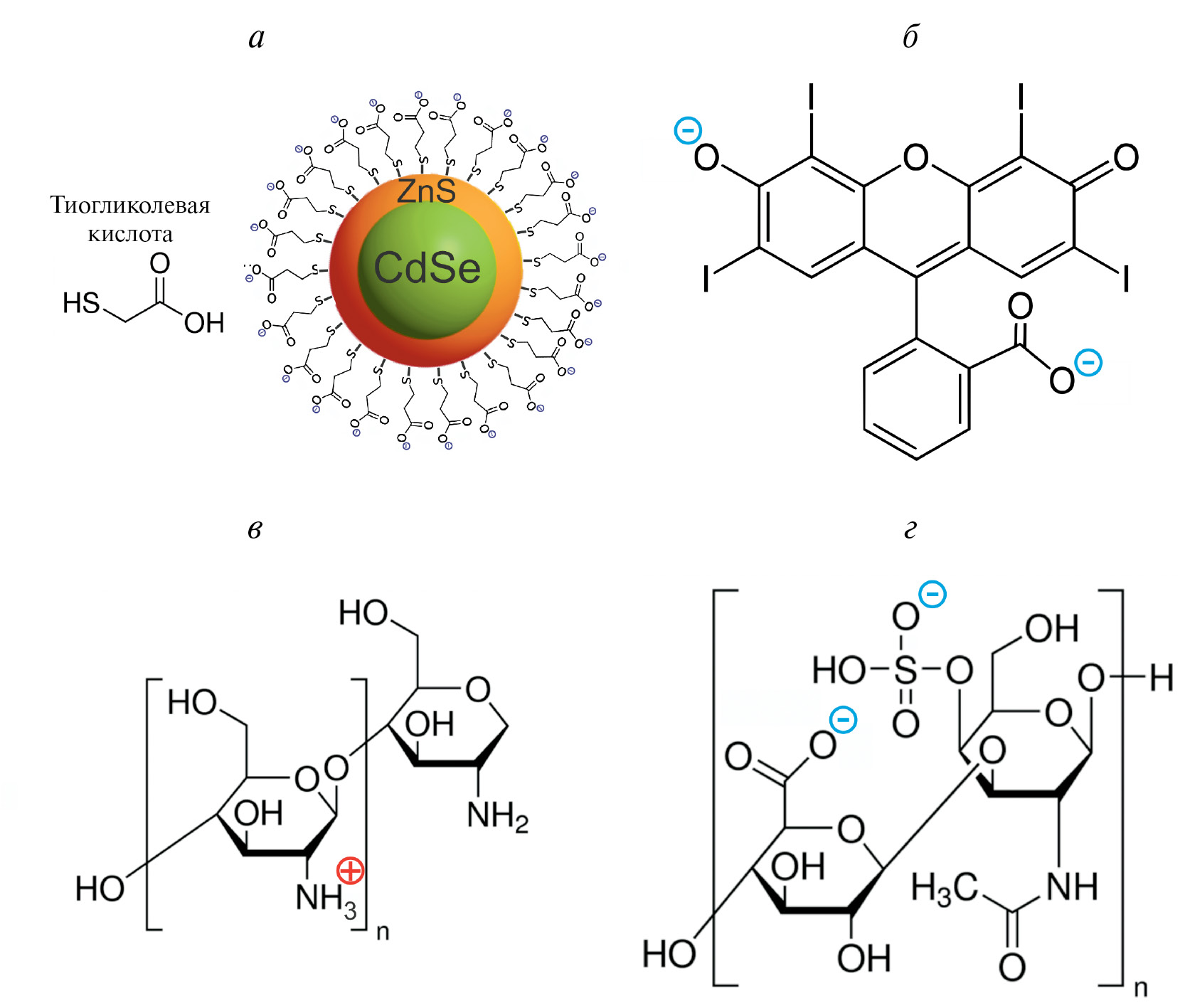 Рис. 1. Структурные формулы квантовых точек CdSe/ZnS (а), красителя эритрозина В (б) и биополимеров: хитозан (в) и хондроитин сульфат (г)