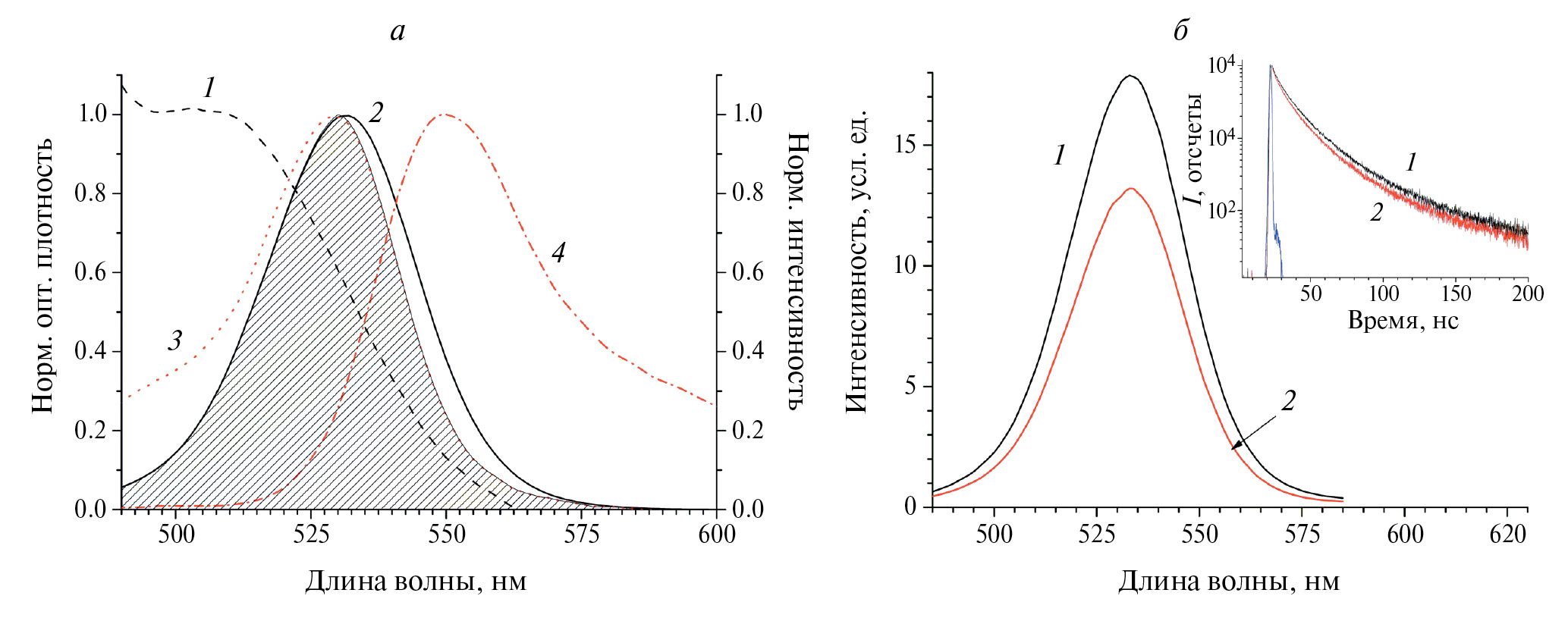Рис. 2. Нормированные спектры поглощения и ФЛ квантовых точек CdSe/ZnS (1, 2) и красителя эритрозина B (3, 4) в композите (а). Спектры ФЛ и кривые затухания ФЛ (на вставке) CdSe/ZnS в композите без (1) и с акцептором энергии (2) (б)